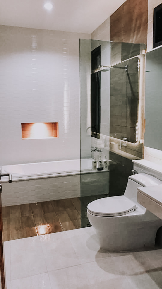 ในขณะที่ห้องน้ำมีพื้นที่ใช้สอยที่เพียงพอ ภายในแบ่งการใช้งานแบบแห้งและแบบเปียกได้อย่างเป้นสัดส่วน พร้อมกับมีอ่างอาบน้ำไว้ให้แช่ผ่อนคลายอีกด้วย