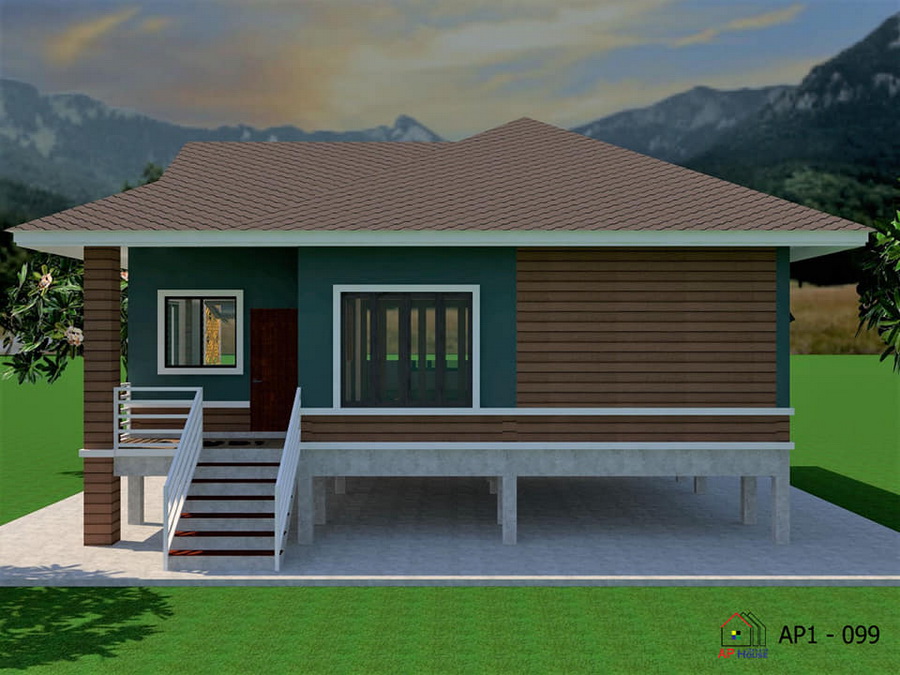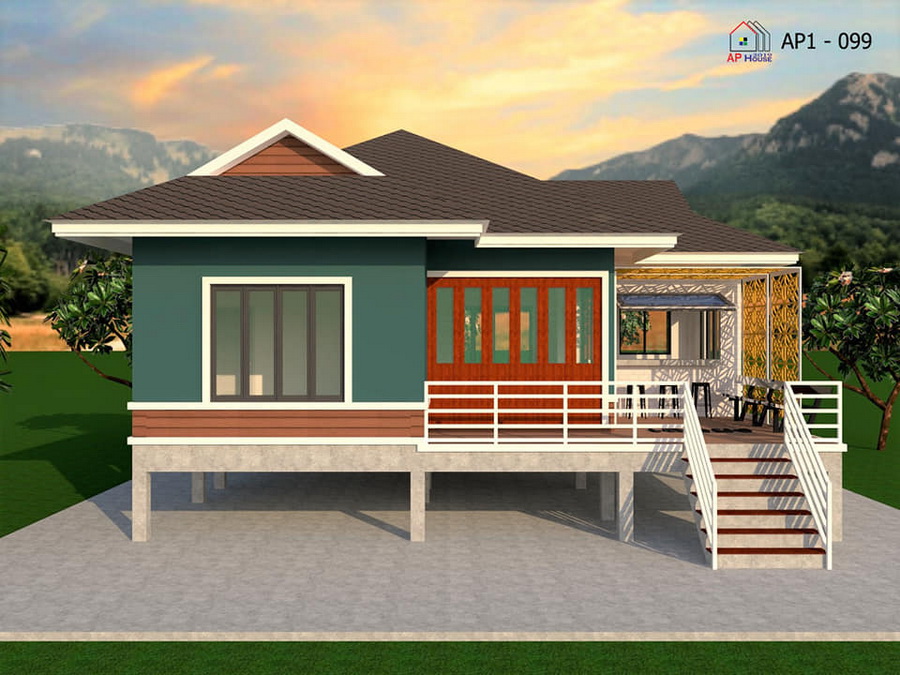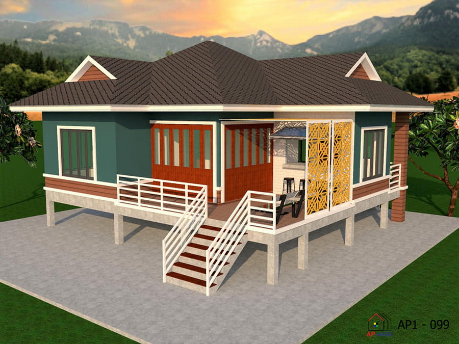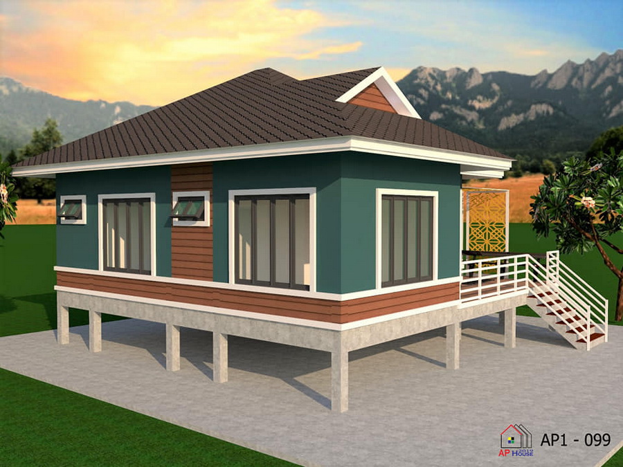 แบบบ้านหลังนี้เป็นบ้านชั้นเดียวที่ถูกออกแบบยกพื้นสูง ตัวบ้านมีพื้นฐานดีไซน์และตัวโครงสร้างที่เรียบง่ายตามแบบฉบับบ้านแนวโมเดิร์น โดยมีการออกแบบหลังคาทรงมะนิลา จึงให้กลิ่นอาบแบบบ้านทรงไทย ด้านการตกแต่งนั้น ผนังภายนอกประกอบไปด้วยโทนสีเขียวออกฟ้า สีขาวและสีน้ำตาลที่ผสานกันอย่างลงตัว
