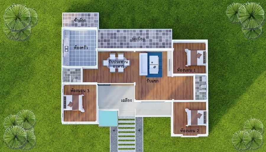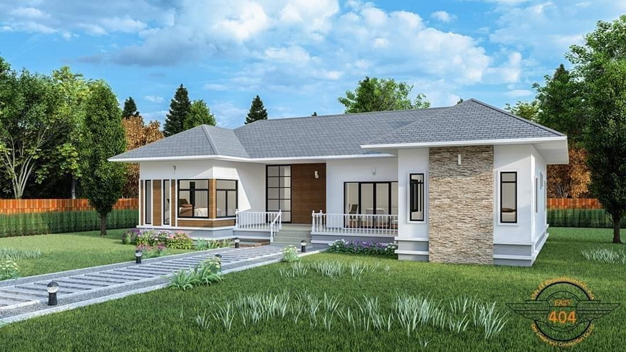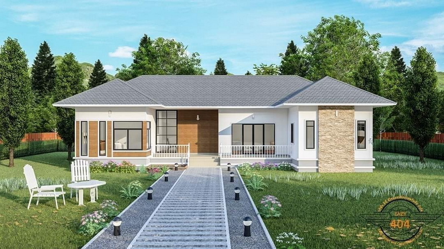 แบบบ้านหน้ากว้างสไตล์คอนเทมโพรารี พื้นที่ใช้สอยกว้างทั้งภายใน-ภายนอก 3 ห้องนอน 2 ห้องน้ำ พื้นที่ 192 ตร.ม.