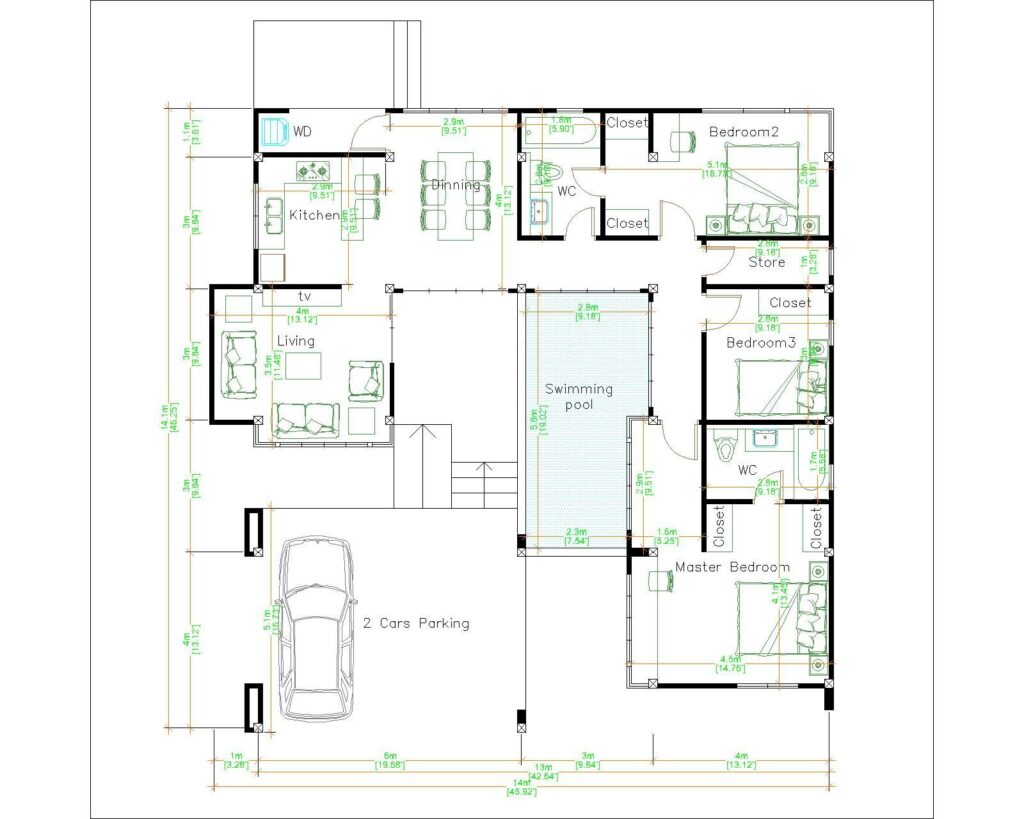 แบบบ้านหลังนี้ประกอบไปด้วย 3 ห้องนอน 2 ห้องน้ำ 1 ห้องนั่งเล่น 1 ห้องครัว 1 ห้องทานอาหาร พร้อมสระว่ายน้ำ และโรงจอดรถหน้าบ้าน บนพื้นที่ใช้สอยประมาณ 196 ตารางเมตรครับ