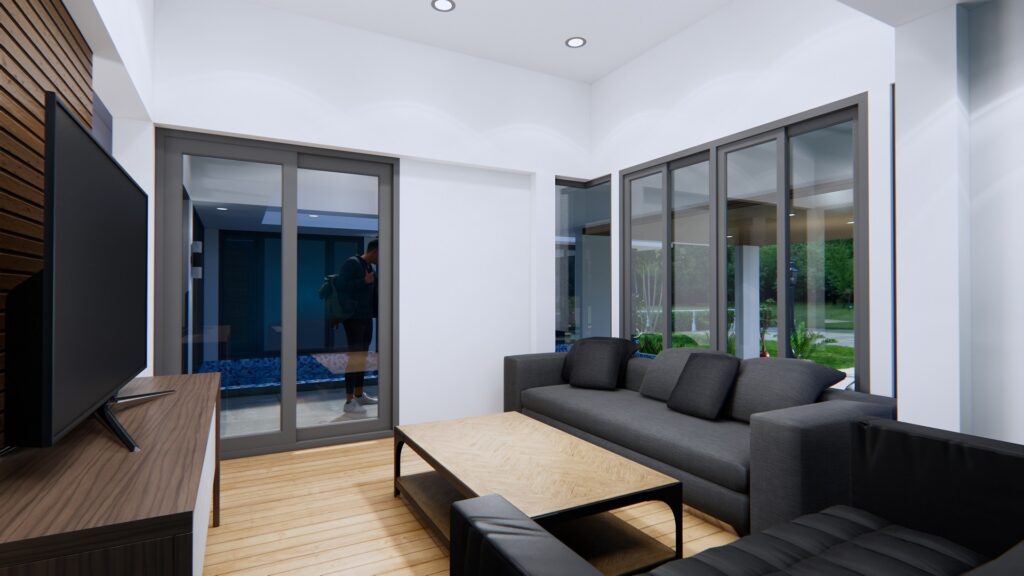 บริเวณนี้คือห้องโถง ตกแต่งในสไตล์โมเดิร์นที่เน้นความเรียบง่ายทันสมัย ผนังและฝ้าเพดานเลือกใช้โทนสีขาว เติมความอบอุ่นด้วยองค์ประกอบจากไม้ของผนังห้องด้านที่วางทีวี พื้น โต๊ะ และชั้นวางทีวี และยังมีการเลือกใช้ผนังกระเบื้องแก้วสีฟ้าในด้านหนึ่งของห้องอีกด้วย นอกจากนี้ยังมีสีดำของทีวีและโซฟาที่ช่วยเพิ่มความเท่ขรึมให้กับห้องนี้