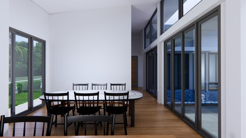 ห้องรับประทานอาหารที่ถูกออกแบบให้มีกระจกโปร่งแสงขนาบข้าง การออกแบบฟังก์ชันในลักษณะนี้จะช่วยเพิ่มบรรยากาศของการทานอาหารแบบกึ่งกลางแจ้ง