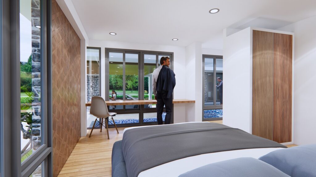 จะเห็นได้ว่าห้องนอนนั้นจะเน้นความอบอุ่นและหรูหรา และยังมาหน้าต่างบานใหญ่รอบ ๆ ห้องอีกด้วยซึ่งแม้ว่าจะช่วยให้แสงธรรมชาติส่องเข้าทั่วถึงก็ตาม แต่ยังไงก็ควรจะติดผ้าม่านสวย ๆ ไว้เพื่อความเป็นส่วนตัวด้วยครับ