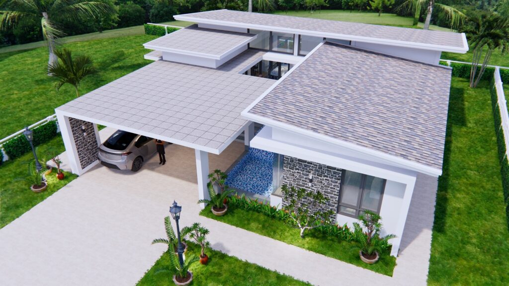 ความโดดเด่นอย่างหนึ่งของบ้านหลังนี้ก็คือการเลือกใช้หลังคาทรงเพิงแหงนเล่นระดับลดหลั่นกันอย่างมีเอกลักษณ์ แต่ในส่วนบริเวณจอดรถเลือกใช้หลังคาทรงสแลปแทน