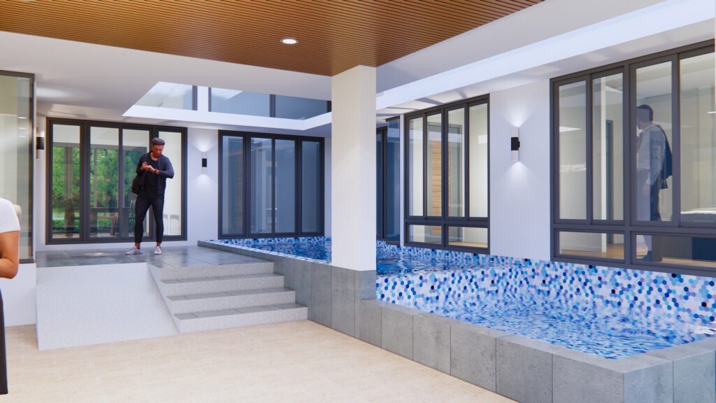 บริเวณโถงทางเข้ามีสระน้ำที่มีการออกแบบโดยเล่นระดับพื้นที่ ซึ่งเด็ก ๆ ตัวเล็ก สามารถว่ายเล่นได้ มีดีไซน์ที่สวยงามและดูโดดเด่นสะดุดตาไม่น้อย