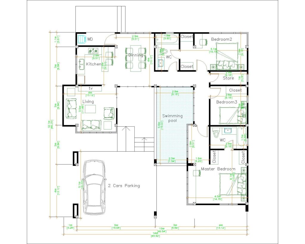 แบบบ้านหลังนี้ประกอบไปด้วย 3 ห้องนอน 2 ห้องน้ำ 1 ห้องนั่งเล่น 1 ห้องครัว/รับประทานอาหาร 1 ห้องซักล้าง บนพื้นที่ใช้สอยทั้งหมด 196 ตารางเมตร