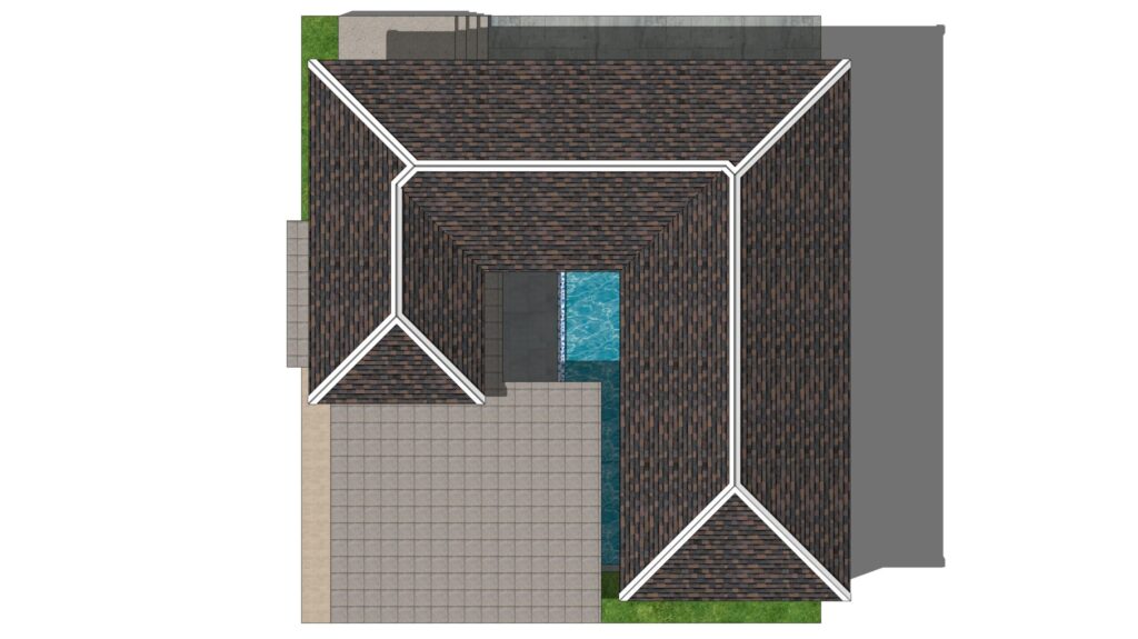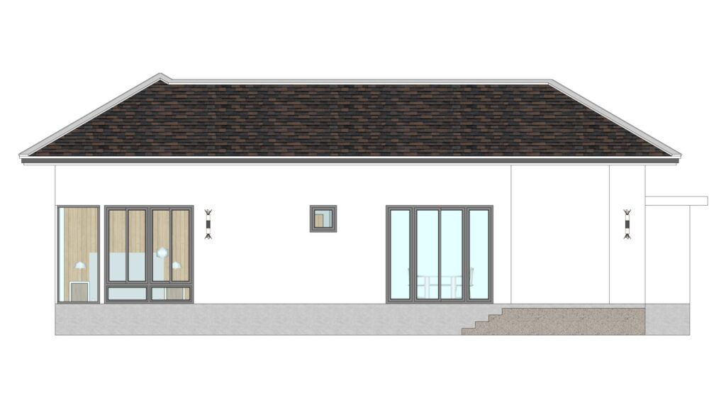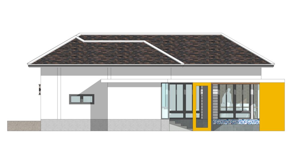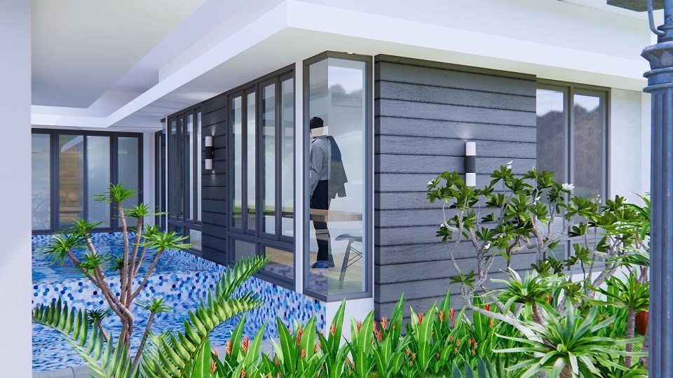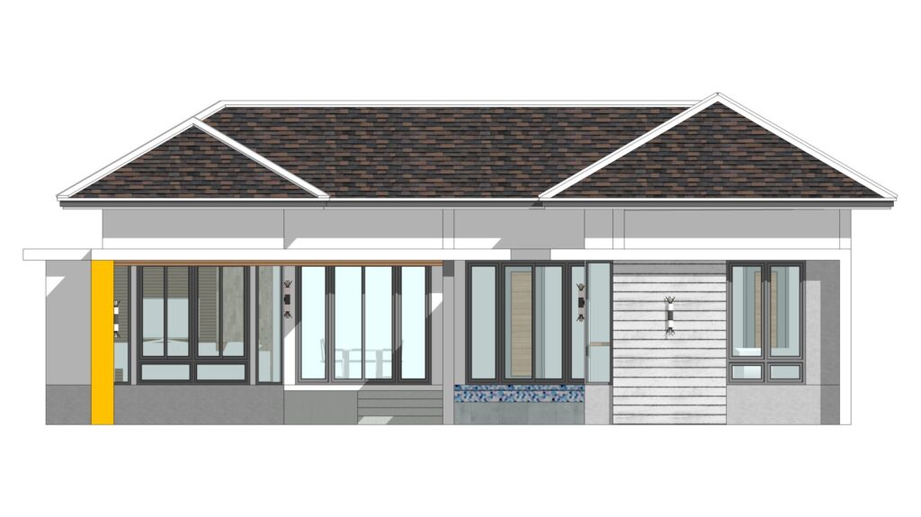 ลักษณะตัวบ้านชั้นเดียว หลังคาทรงปั้นหยา มุงด้วยกระเบื้องโทนสีเทา ผนังภายนอกตกแต่งด้วยโทนสีขาว เสริมด้วยผนังไม้โทนสีเทา รูปทรงบ้านตัวแอลที่มีการออกแบบสระน้ำและเฉลียงไว้บริเวณตรงกลาง นอกจากนี้ ทางเข้าบ้านยังมีโรงจอดรถใต้ชายคาอยู่ด้วย