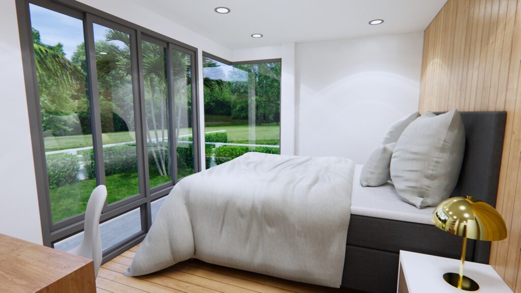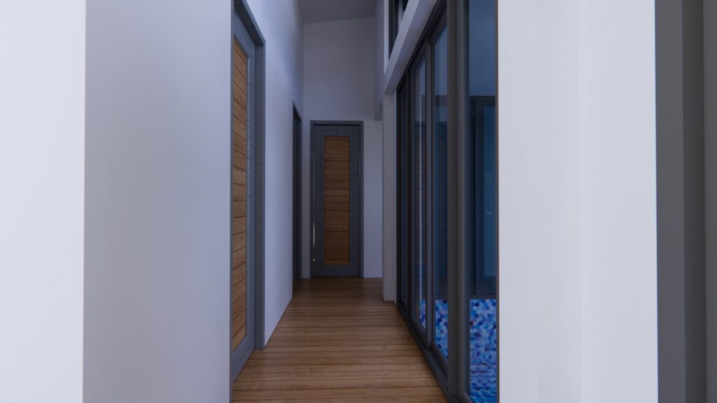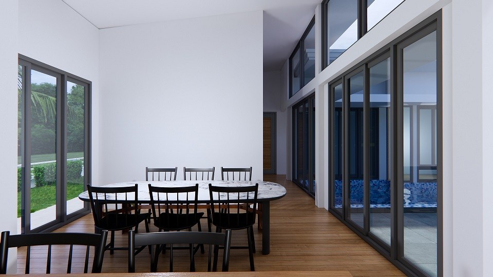 บ้านหลังนี้เลือกใช้ประตูและหน้าต่างแบบกระจกโปร่งแสง จึงทำให้แสงธรรมชาติสามารถส่องเข้าภายในบ้านอย่างทั่วถึง และยังทำให้พื้นที่ภายนอกและภายในเชื่อมโยงกันอย่างลงตัวอีกด้วย