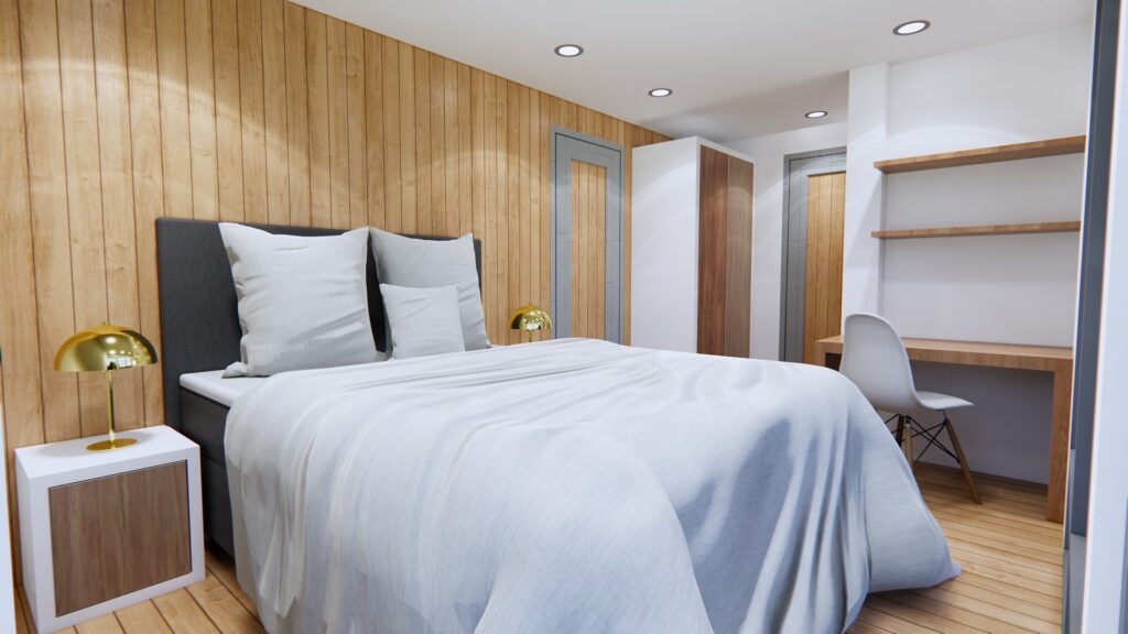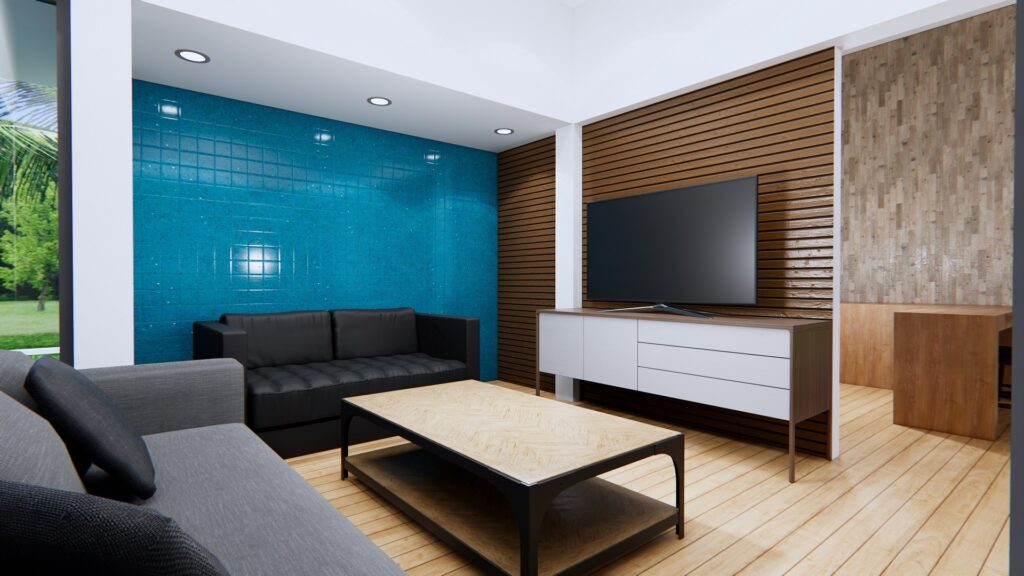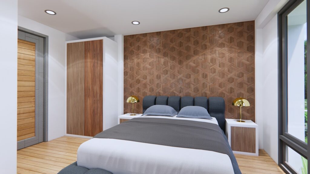 การตกแต่งฝ้าและเพดานเลือกใช้โทนสีขาว พื้นเลือกใช้ไม้ เฟอร์นิเจอร์เลือกใช้โทนสีเรียบง่าย เน้นโทนสีดำ และน้ำตาล ให้บรรยากาศที่อบอุ่น เรียบง่าย และความโปร่งสว่าง