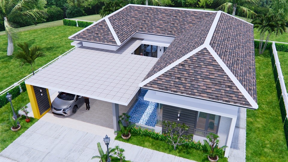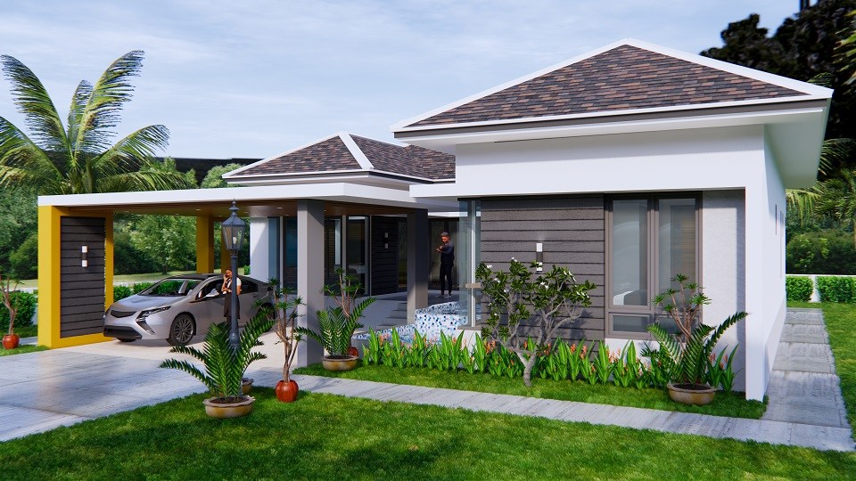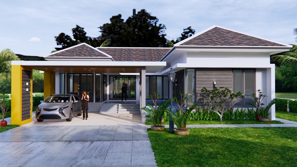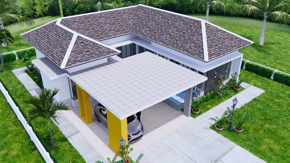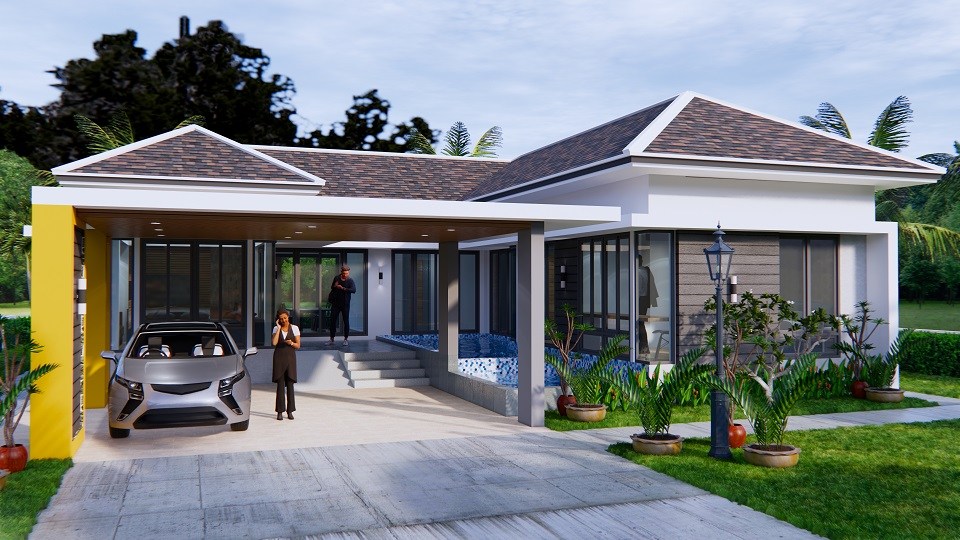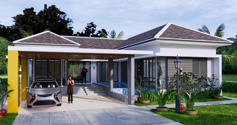 แบบบ้านปั้นหยาชั้นเดียวทรงตัวแอล (L-Shaped House) ผลงานการออกแบบโดยทีมงาน Sam House Plan ดีไซน์โดดเด่น ทันสมัย มีเอกลักษณ์ พร้อมด้วยฟังก์ชันลงตัวครบครัน พิถีพิถันทุกรายละเอียดการออกแบบ ตามมาชมรายละเอียดกันเลยครับ
