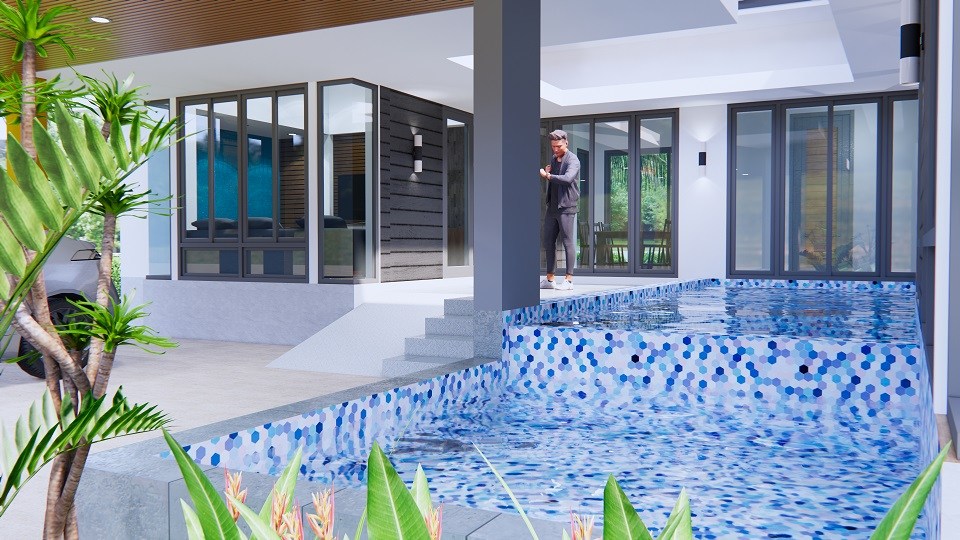 เฉลียงทางเข้าและสระน้ำหน้าบ้าน