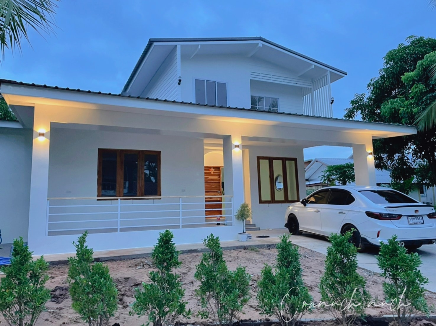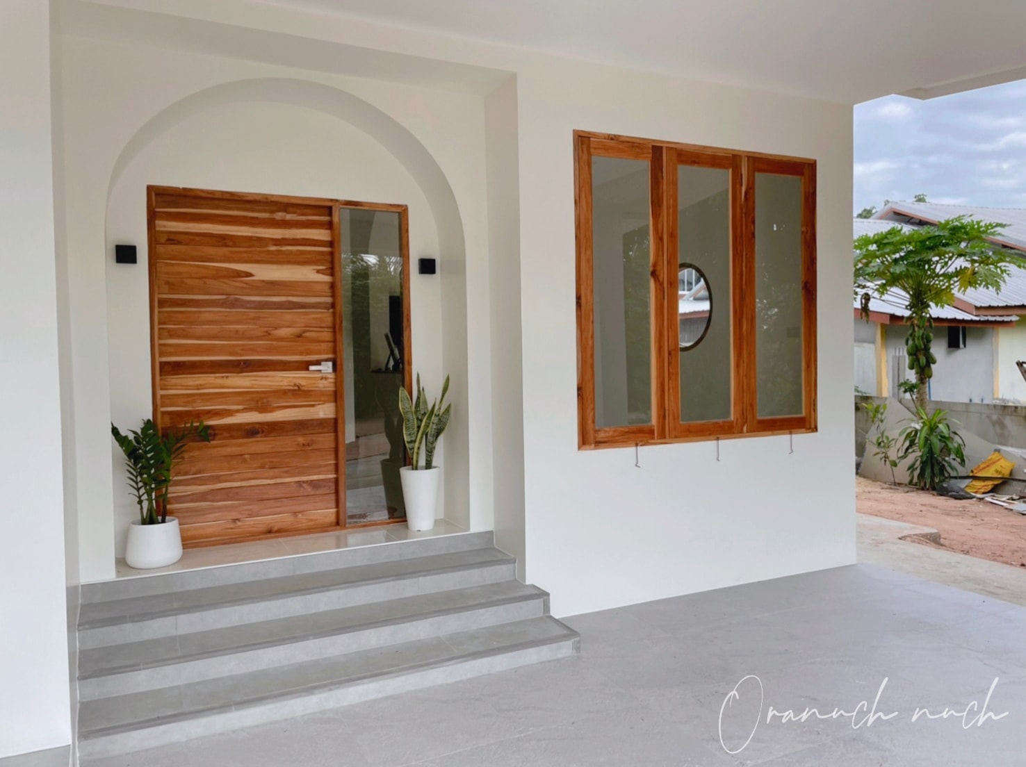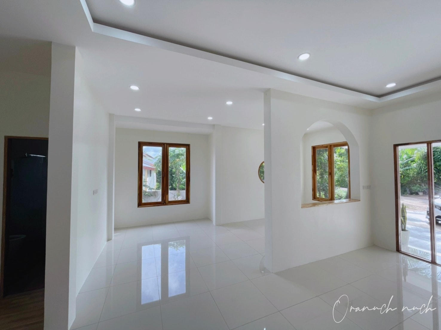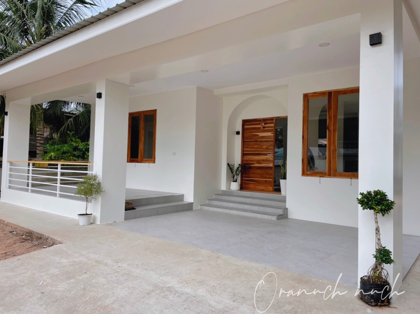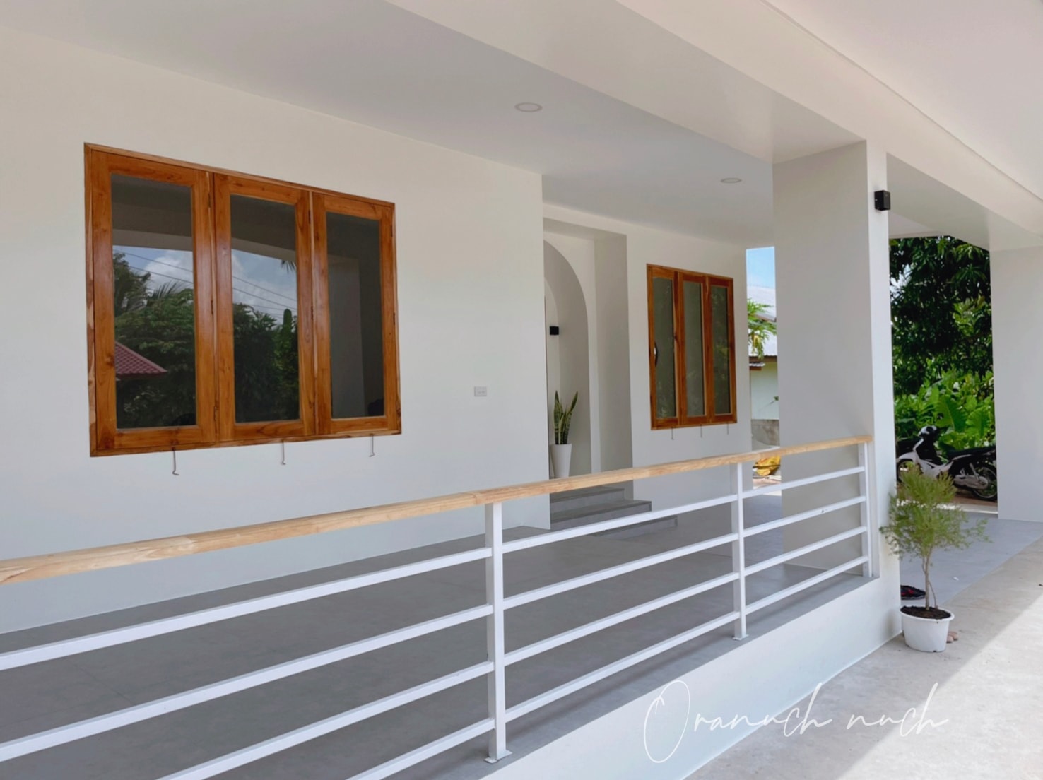 การตกแต่งใหม่จะให้กลิ่นอายมินิมอลกันมาตั้งแต่หน้าบ้าน ซึ่งสะท้อนจากโทนสีขาว ประตูและหน้าต่างไม้ พร้อมบรรยากาศแบบโล่ง ๆ