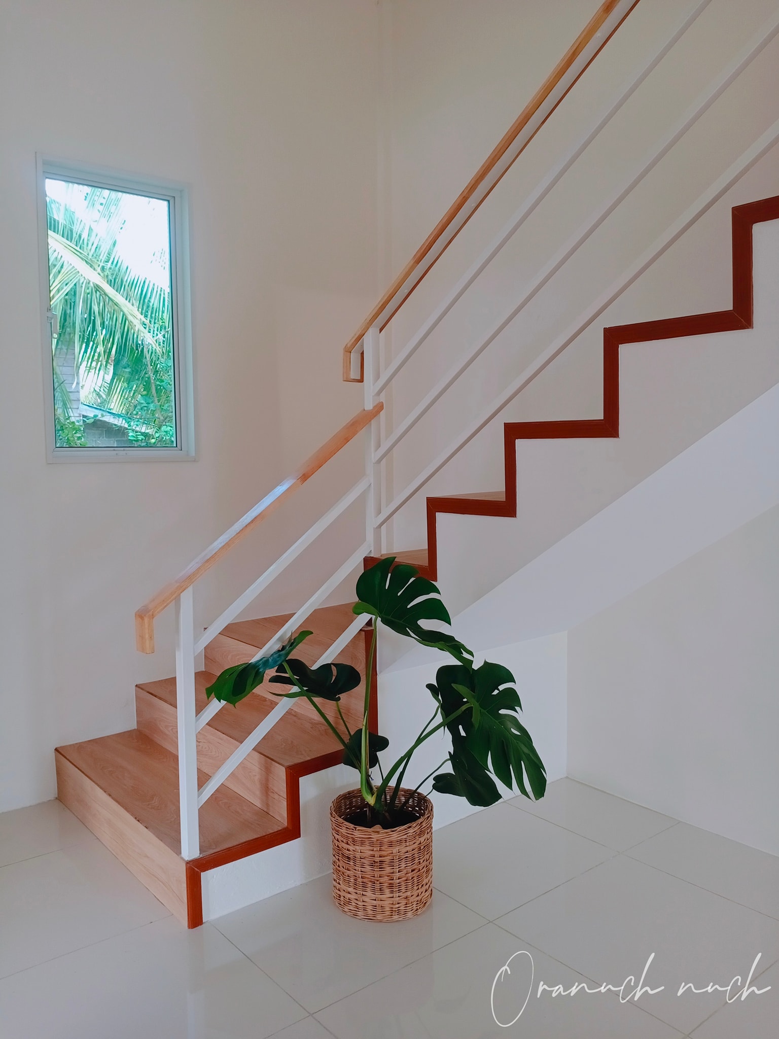 บันไดขึ้นไปยังชั้นสองปูด้วยกระเบื้องลายไม้ ที่เมื่อจับคู่กับต้นไม้และตะกร้าไม้หวายก็เข้ากันได้ดีแบบสุด ๆ
