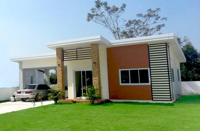 ตัวบ้านขนาดชั้นเดียว โครงสร้างคอนกรีต ผนังภายนอกคุมโทนสีขาว เสริมดีเทลการตกแต่งด้วยผนังอิฐ ระแนงเหล็ก และเสาหินทรายที่เฉลียงด้านหน้า ด้านข้างของตัวบ้านมีที่จอดรถใต้ชายคารองรับรถยนต์ได้ 1 คัน บริเวณรอบๆ สามารถแต่งเติมสนามหญ้า เพิ่มสีเขียวให้ภาพรวมของบ้านดูอ่อนโยนและสบายตายิ่งขึ้น