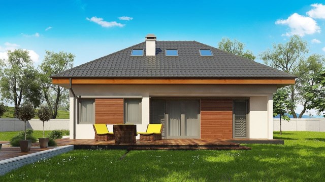 ตัวบ้านขนาดกำลังดี เลือกใช้โครงสร้างคอนกรีต ที่มีความแข็งแรง ออกแบบรูปทรงบ้านที่เรียบง่าย รองรับการใช้งานของครอบครัวด้วยเฉลียงหลังบ้าน และซุ้มไม้ ดูน่ารักและอบอุ่นในเวลาเดียวกัน จับคู่กับหลังคาปั้นหยา ได้ความภูมิฐานของบ้านแบบเต็มๆ