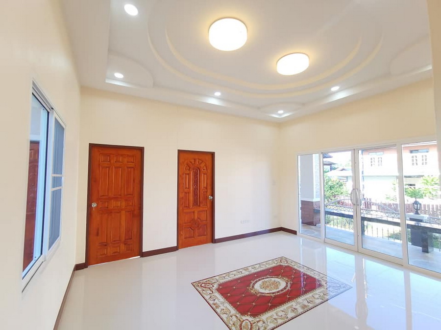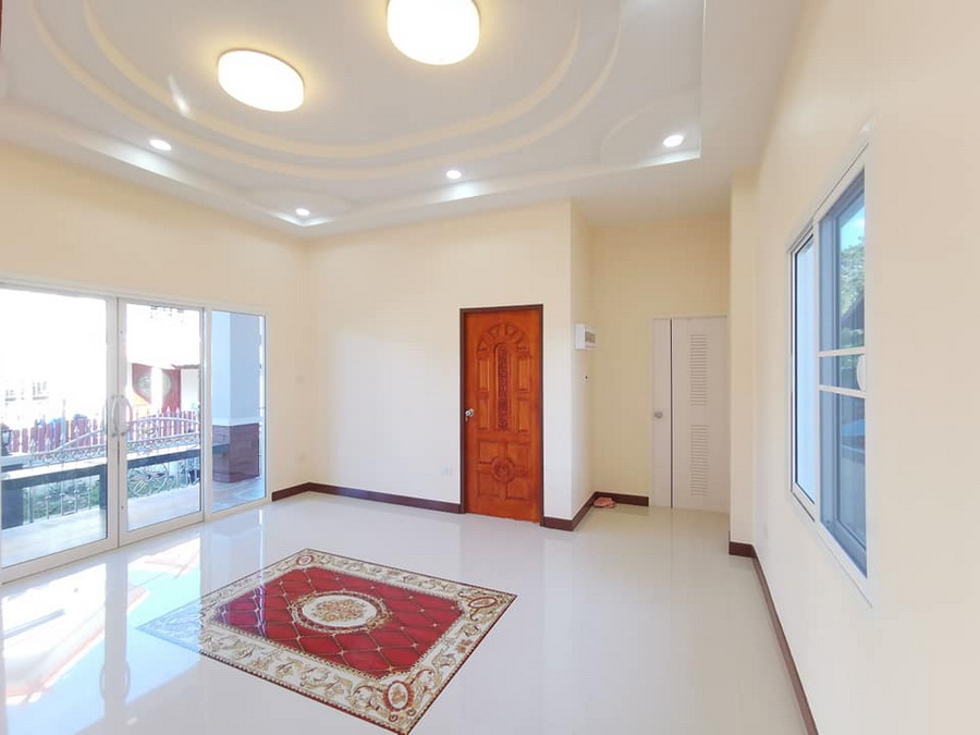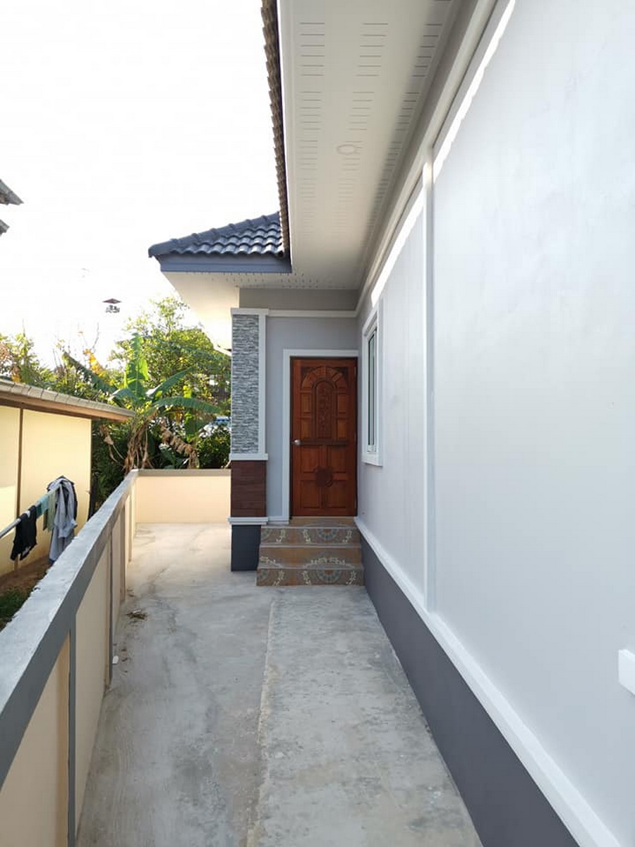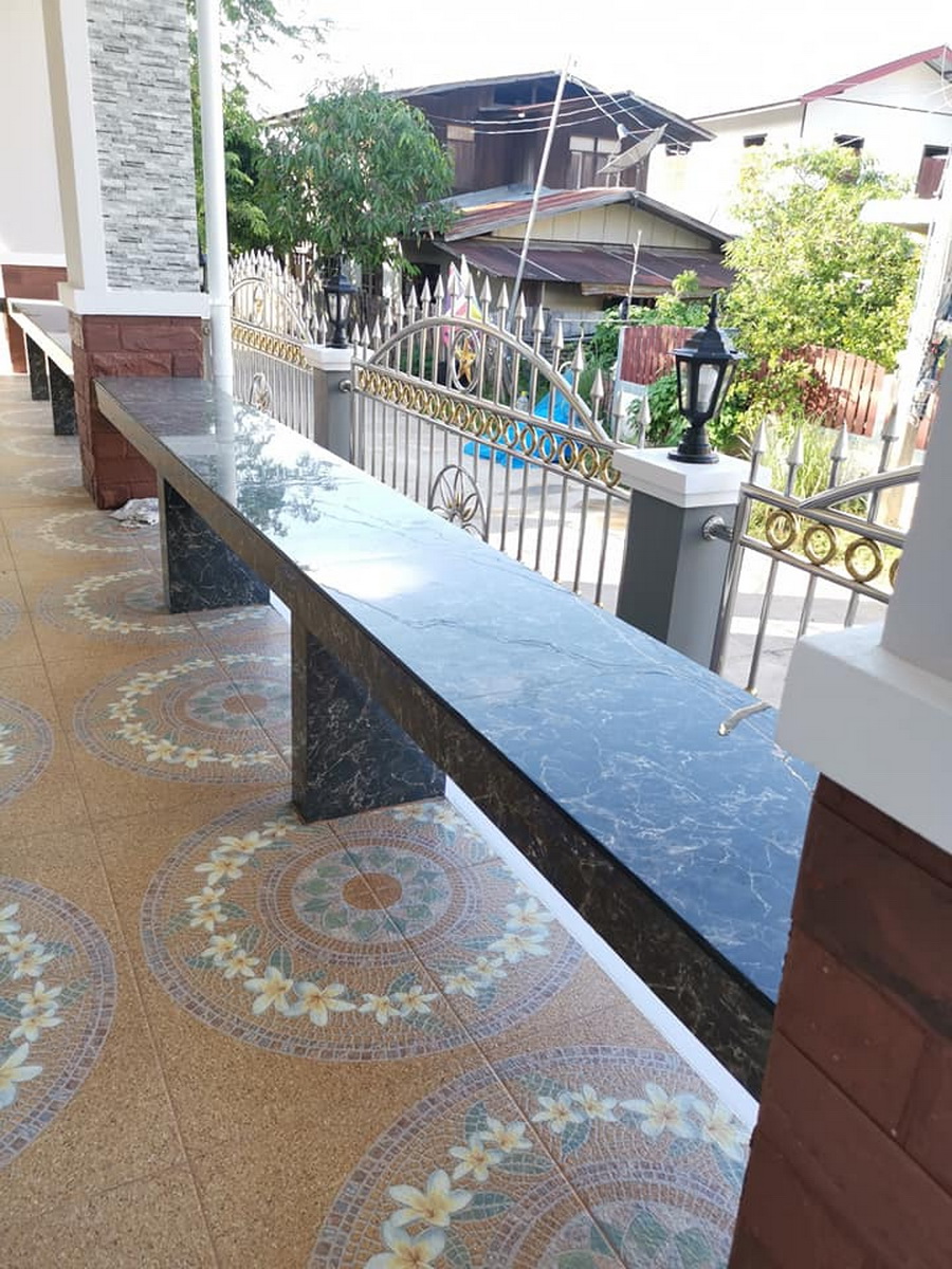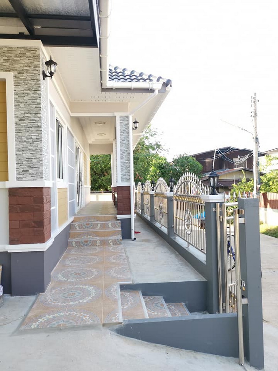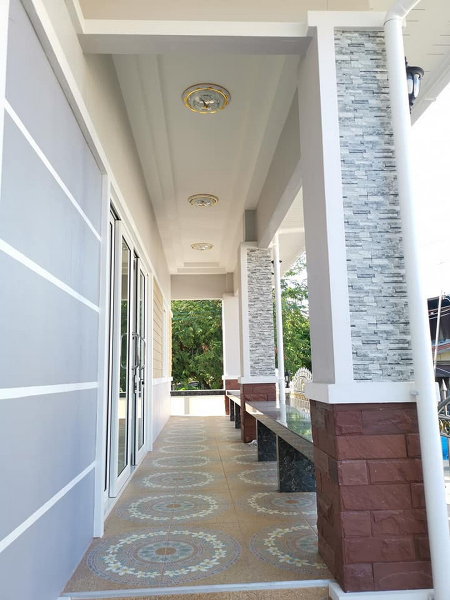 บริเวณหน้าบ้านออกแบบเป็นเฉลียงกว้างพร้อมกับม้านั่งยาวที่ปูด้วยกระเบื้องลายหินอ่อน จึงเป็นมุมพักผ่อนที่ให้ควาสบายและมีวิวที่สวยงามอีกด้วย
