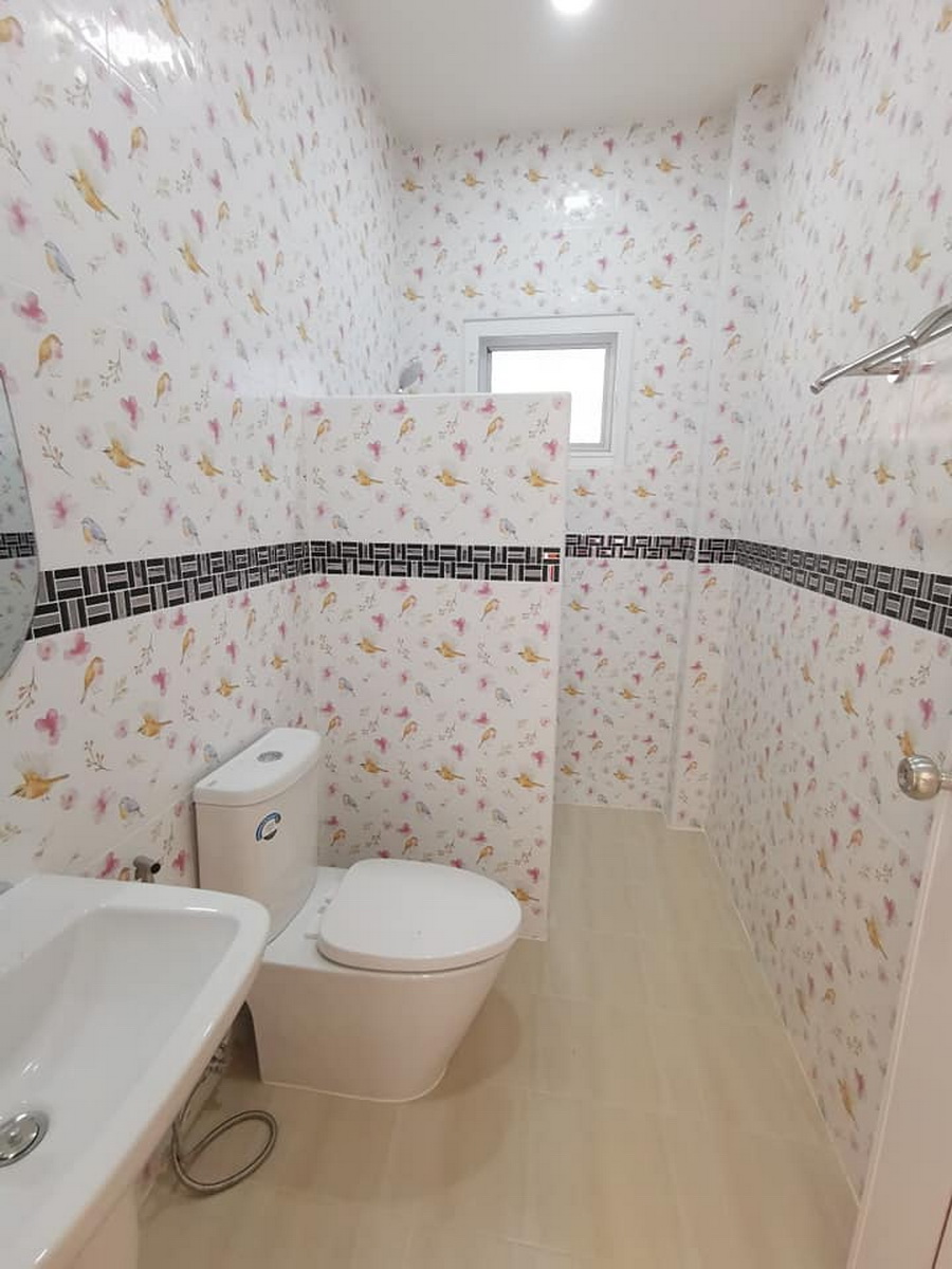 สำหรับห้องน้ำ เป็นอีกห้องที่ตกแต่งภายในสวยงามด้วยกระเบื้องลายดอกไม้ ซึ่งภายในจะแบ่งพื้นที่การใช้งานได้อย่างเป็นสัดส่วนทั้งแบบเปียกและแบบแห้ง