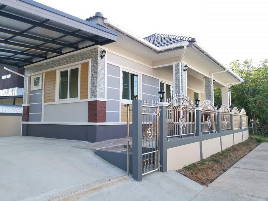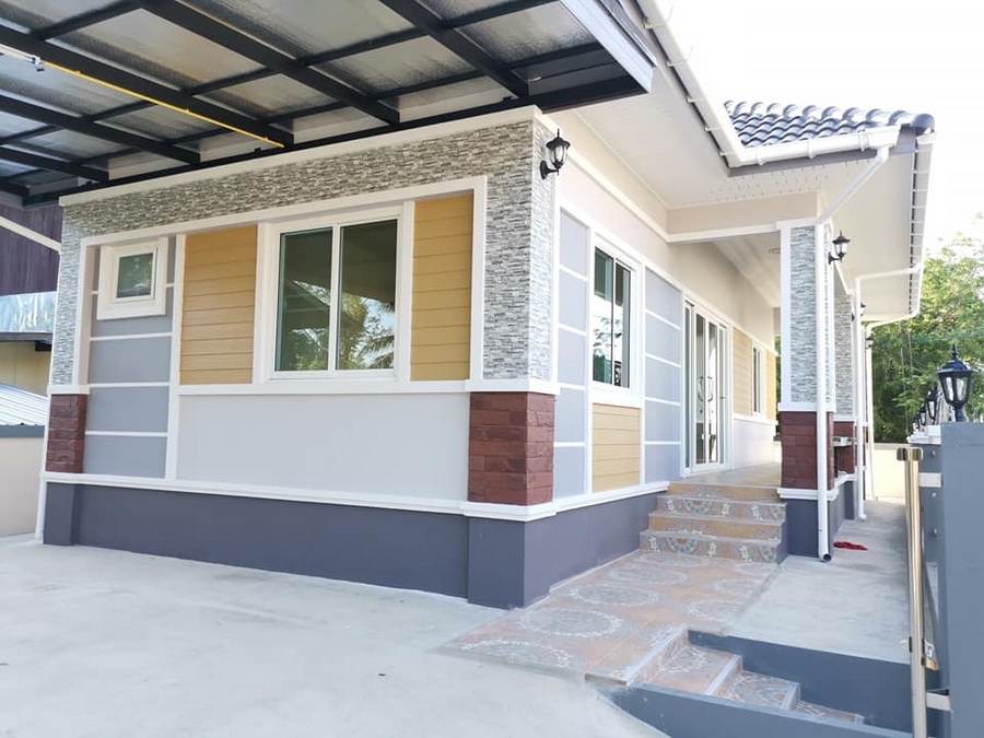 บ้านหลังนี้เป็นบ้านขนาดชั้นเดียว ตัวบ้านถูกออกแบบด้วยดีไซน์แบบบ้านสไตล์คอนเทมโพรารีในลักษณะบ้านทรงหน้ากว้าง ด้านรายละเอียดการตกแต่งนั้น หลังคาบ้านเป็นหลังคาแบบทรงปั้นหยา ผนังภายนอกตกแต่งในโทนสีอ่อนที่ประกอบไปด้วยสีขาวครีม สีฟ้าอ่อนและสีน้ำตาลที่เข้ากันอย่างลงตัว