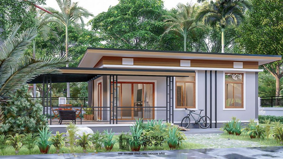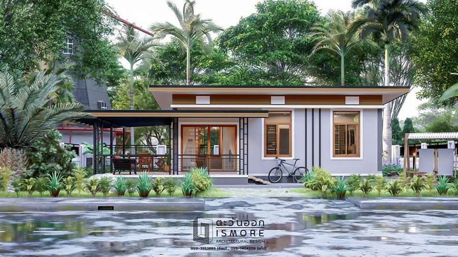 บ้านหลังนี้เป็นแบบบ้านหน้ากว้างขนาดชั้นเดียว ตัวบ้านออกแบบด้วยดีไซน์แบบโมเดิร์นทรงสี่เหลี่ยม มีหลังคาในลักษณะทรงเพิงหมาแหงน ผนังภายนอกตกแต่งด้วยโทนสีเทา เพิ่มดีเทลด้วยสีดำและสีน้ำตาลเพื่อให้บ้านดูโดดเด่นมากยิ่งขึ้น