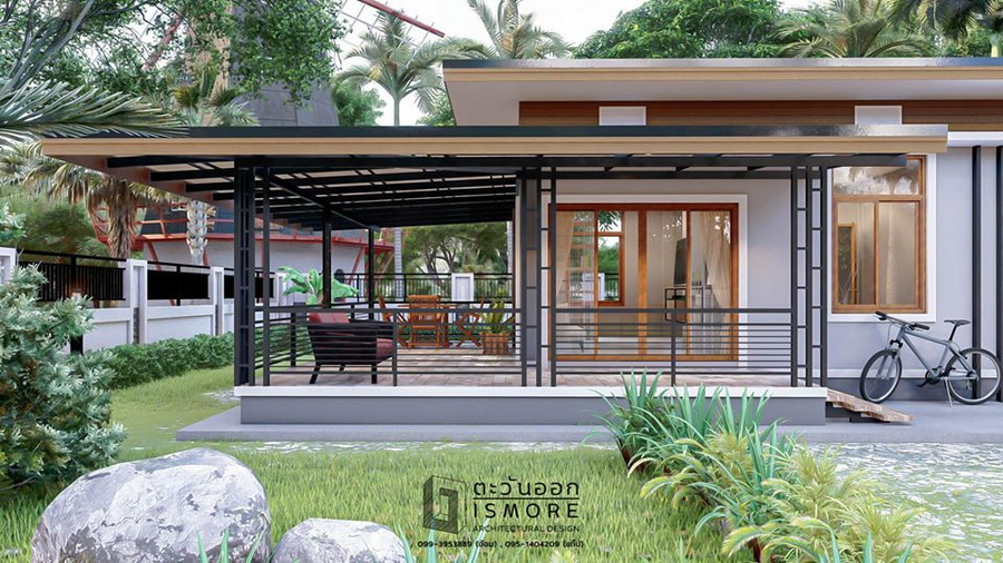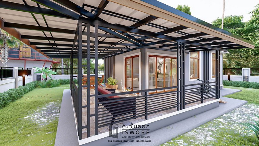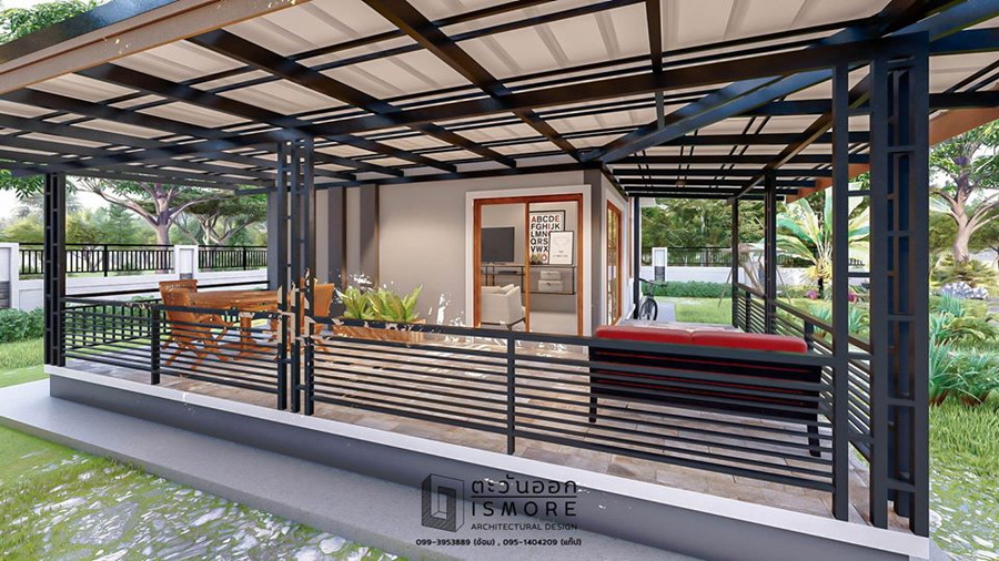 บริเวณด้านข้างออกแบบให้เป็นเฉลียงกว้าง โดยต่อเติมหลังคากันสาดแบบเมทัลชีท มีโครงเหล็กที่ทาด้วยสีดำ ให้ดีไซน์การตกแต่งที่สวยงาม