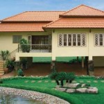 ตัวบ้านขนาดสองชั้น โครงสร้างทำจากคอนกรีต ผนังภายนอกฉาบปูนสีขาว โดดเด่นที่โทนสีเขียวของหลังคากระเบื้องทรงมนิลา บริเวณทางเข้าบ้านมีชานเล็กๆ รอบๆ รายล้อมไปด้วยสนามหญ้า ใกล้ชิดริมน้ำและป่าไม้