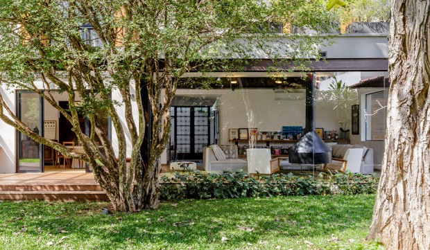 ผนังกระจกเป็นอีกหนึ่งองค์ประกอบที่ทำให้ภายในบ้านดูกว้างโล่งโปร่งสบายยิ่งขึ้น