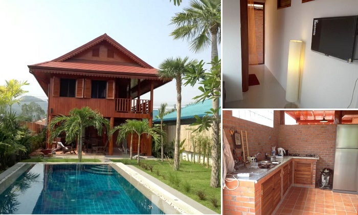 ตัวบ้านออกแบบยกพื้นสูงมีใต้ถุน ด้านหลังจัดเป็นโซนพักผ่อนส่วนตัว ล้อมรั้วไม้ไผ่มีสระว่ายน้ำหรู ประดับประดาไปด้วยไม้ยืนต้นเขตร้อน เติมความสดชื่นให้กับช่วงเวลาพักผ่อน