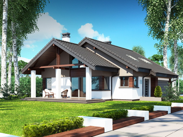ตัวบ้านขนาดสองชั้น เป็นบ้านโครงสร้างคอนกรีต ผนังภายนอกฉาบปูนเรียบทาสีขาว พื้นที่หลังบ้านมีเฉลียงโปร่งใต้ชายคา ออกแบบไว้สำหรับพักผ่อน โครงสร้างหลังคาเลือกใช้ทรงจั่วสูง มุงด้วยกระเบื้องสีเทา มีการแต่งแซมไม้สีเข้มไว้ตามส่วนต่างๆ ของบ้าน เช่น บริเวณมุมหน้าต่าง และผนังบางภายนอกบางจุด
