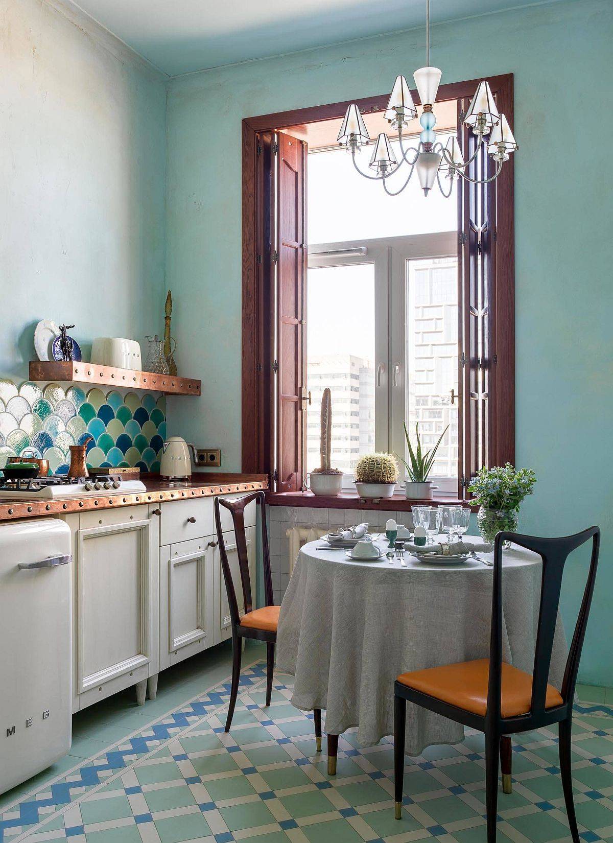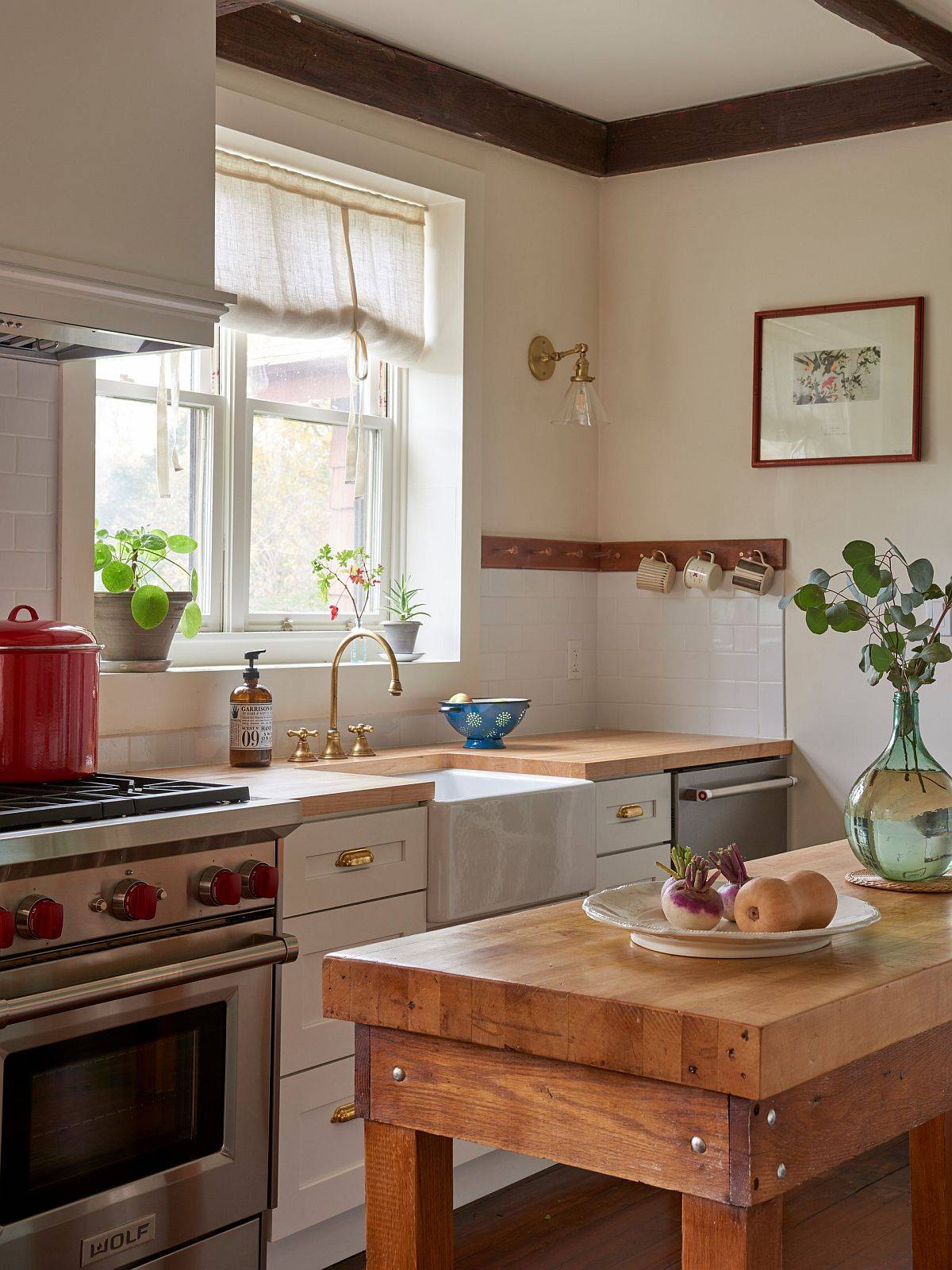 การตกแต่งห้องครัวในสไตล์นี้จะเน้นการเลือกใช้วัสดุที่เรียบง่ายเช่น ไม้ อิฐ กระเบื้อง โดยจะใช้การผสมผสานไปกับโทนสีที่สดใสสวยงาม