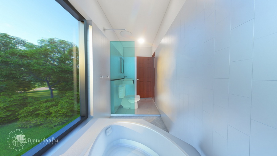 ห้องน้ำถูกออกแบบในลักษณะแบบยาว ภายในแบ่งพื้นที่การใช้งานแบบแห้งและแบบเปียกอย่างเป็นสัดส่วน พร้อมกับมีอ่างอาบน้ำส่วนตัวในแบบผ่อนคลาย