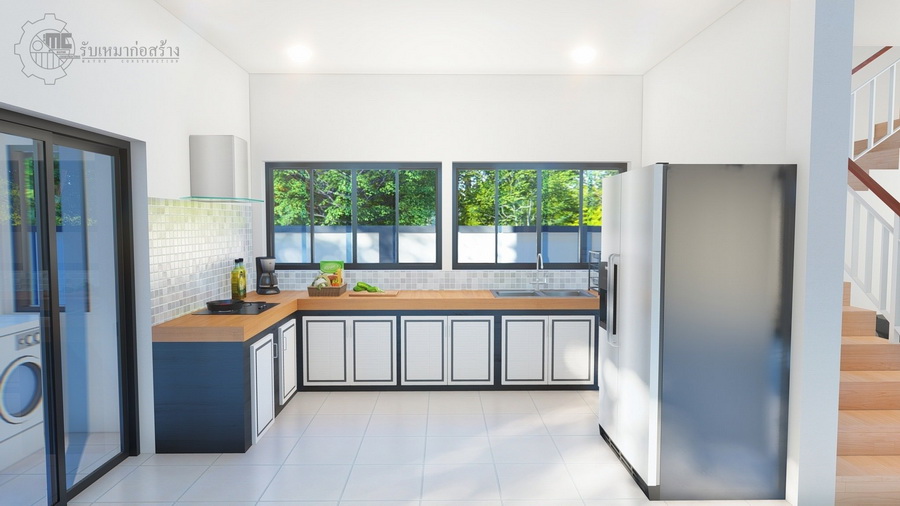 สำหรับห้องครัว เป็นห้องที่เน้นความโป่งสบาย ถ่ายเทอากาศได้ดี จึงเหมาะกับการทำอาหารไทย ภายในติดตั้งด้วยเคาน์เตอร์ครัวแบบติดผนังรูปตัวแอลที่แสนสะดวกสบาย
