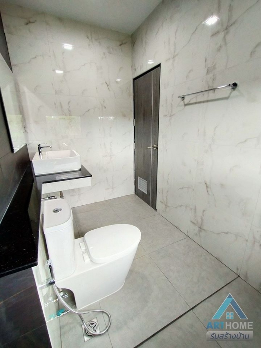 ห้องน้ำเป็นห้องที่ออกแบบเรียบง่ายเน้นการใช้งาน ผนังห้องตกแต่งด้วยแผ่นกระเบื้องลายหินอ่อน ภายในมีสิ่งอำนวยความสะดวกที่ครบทุกฟังก์ชันการใช้งาน