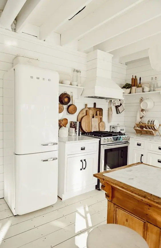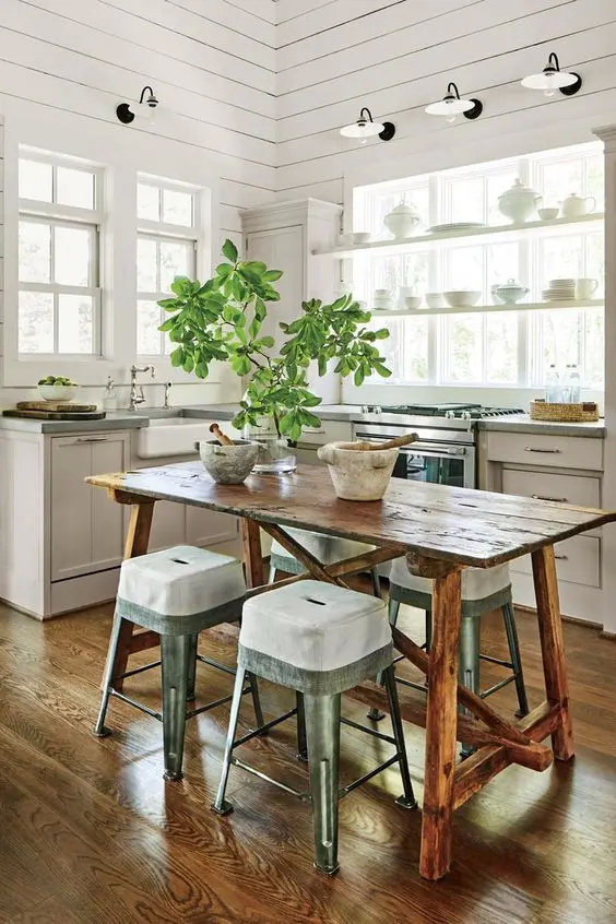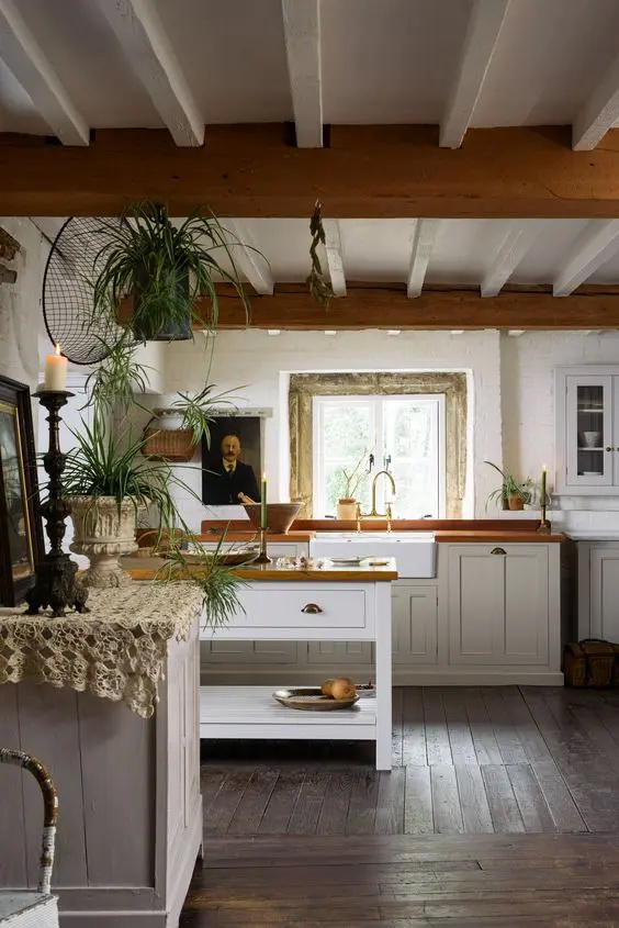 เราอาจจะเริ่มการตกแต่งในสไตล์นี้ด้วยวิธีง่าย ๆ นั่นคือการเลือกใช้ผนัง หรือคานไม้เปลือย ๆ ที่เผยให้เห็นเนื้อวัสดุ ของตกแต่งอื่น ๆ ก็ควรจะเป็นไปในทิศทางนี้ เน้นเฟอร์นิเจอร์ที่มีลวดลายเรียบ ๆ มีโทนสีอ่อน ๆ เพียงเท่านี้เราก็จะได้ห้องครัวแนวคอทเทจไว้ใช้งานแล้ว
