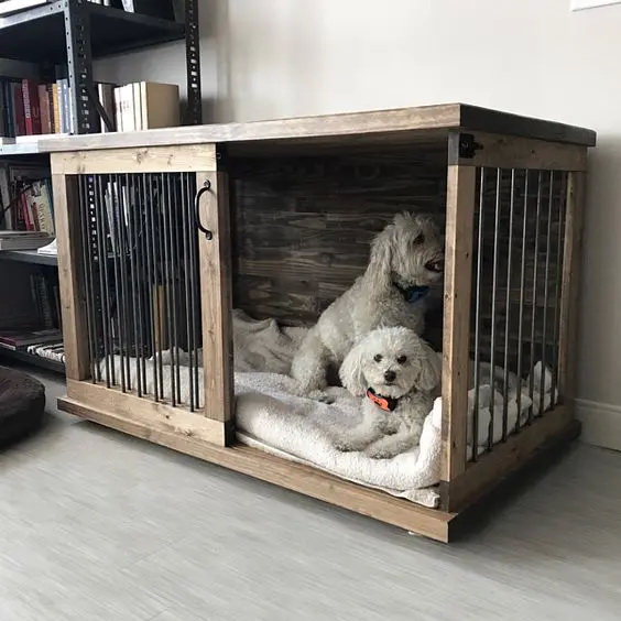 1. คอกไม้สำหรับสุนัขที่สามารถใส่กรงสำเร็จรูปเข้าไปภายในได้เลย