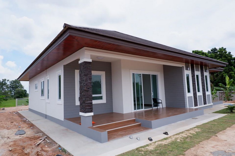 ลักษณะบ้านชั้นเดียว ฐานของบ้านถูกยกขึ้นต่ำ ตัวบ้านออกแบบด้วยสไตลคอนเทมโพรารีหรือทรงร่วมสมัย ตัวบ้านออกแบบหน้ากว้าง จึงมีพื้นที่ใช้สอยที่กว้างขวาง ผนังภายนอกตกแต่งด้วยโทนสีเทาสลับกับสีขาว มีหลังคาทรงปั้นหยาที่มุงด้วยกระเบื้องแบบเรียบ