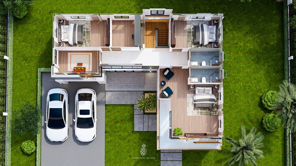 แบบบ้านสองชั้นสไตล์คอนเทมโพรารีหลังนี้ประกอบไปด้วย 4 ห้องนอน 3 ห้องน้ำ 1 ห้องรับแขก 1 ห้องครัว 1 ห้องทำงาน 1 ห้องพระ 2 ที่จอดรถ พื้นที่ใช้สอย 215 ตารางเมตร