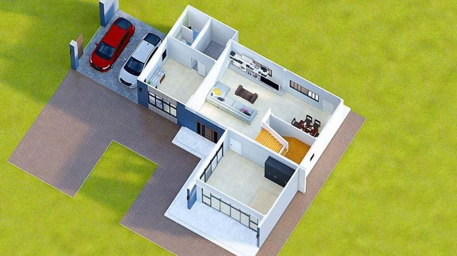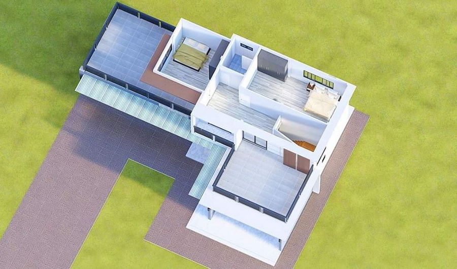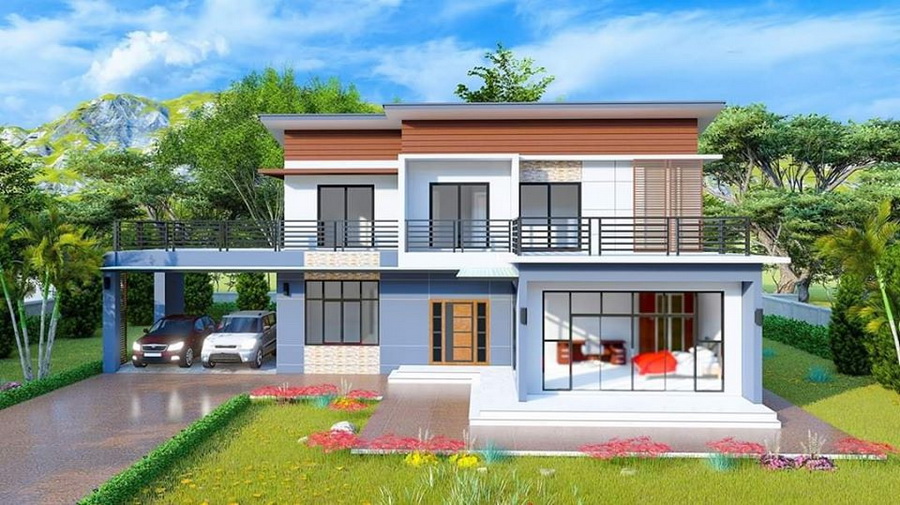 แบบบ้านสองชั้นสไตล์โมเดิร์นหลังนี้ประกอบไปด้วย 3 ห้องนอน 2 ห้องน้ำ 1 ห้องโถงนั่งเล่น 1 ห้องครัว พร้อมดาดฟ้าเปิดโล่ง 2 แห่ง พื้นที่จอดรถ 2 คัน พื้นที่ใช้สอย 227 ตารางเมตร งบประมาณก่อสร้าง 2.29 ล้านบาท