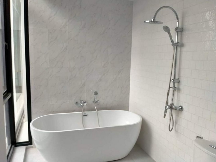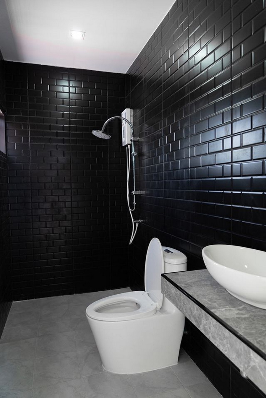 สำหรับห้องน้ำ เป็นห้องที่มีดีไซน์เรียบง่าย ภายในตกแต่งด้วยผนังกระเบื้องลายอิฐสีดำ พร้อมกับติดตั้งสิ่งอำนวยความสะดวกอย่างครบครัน
