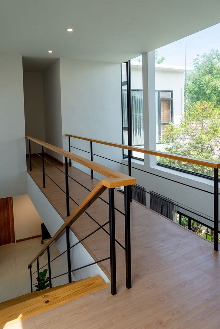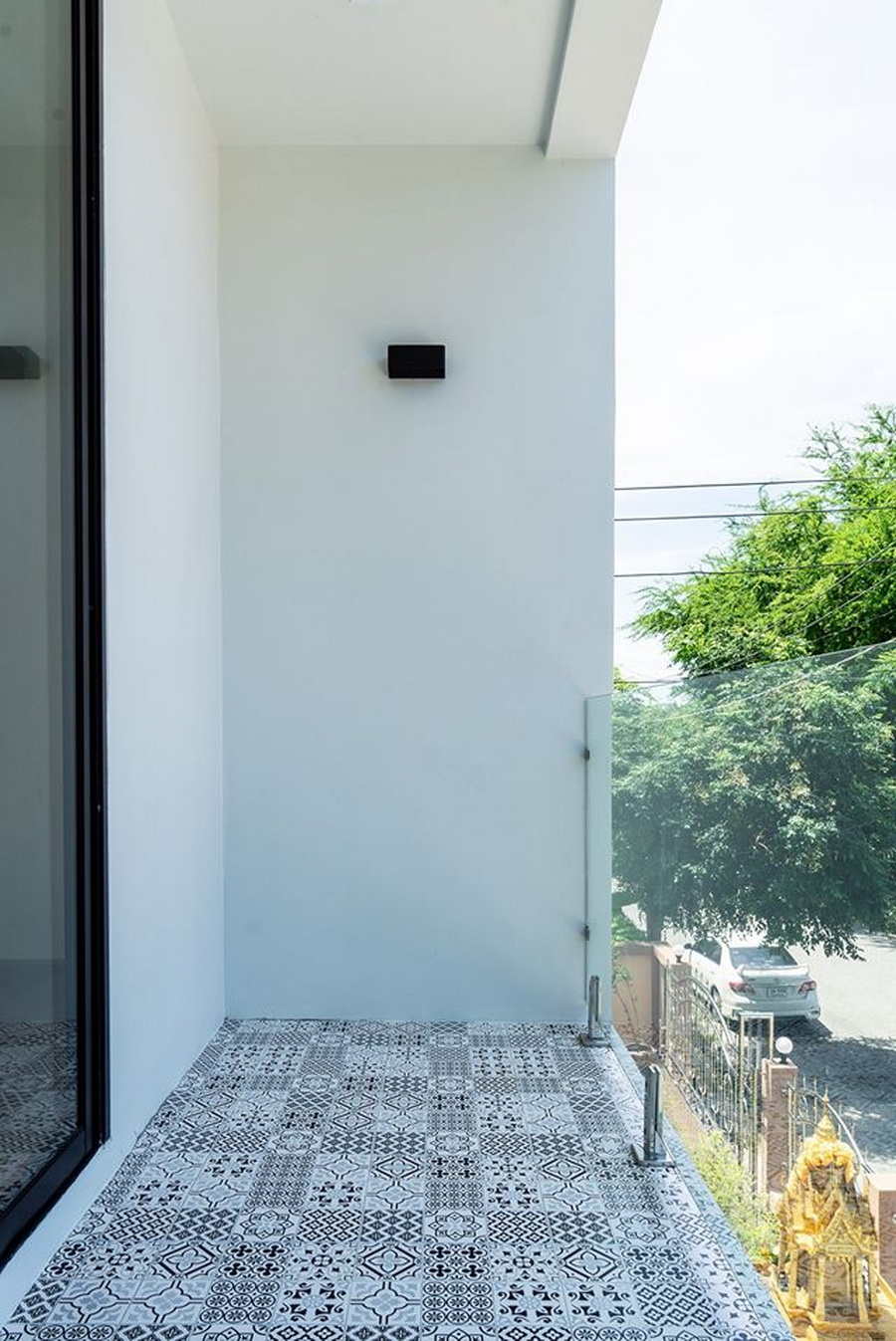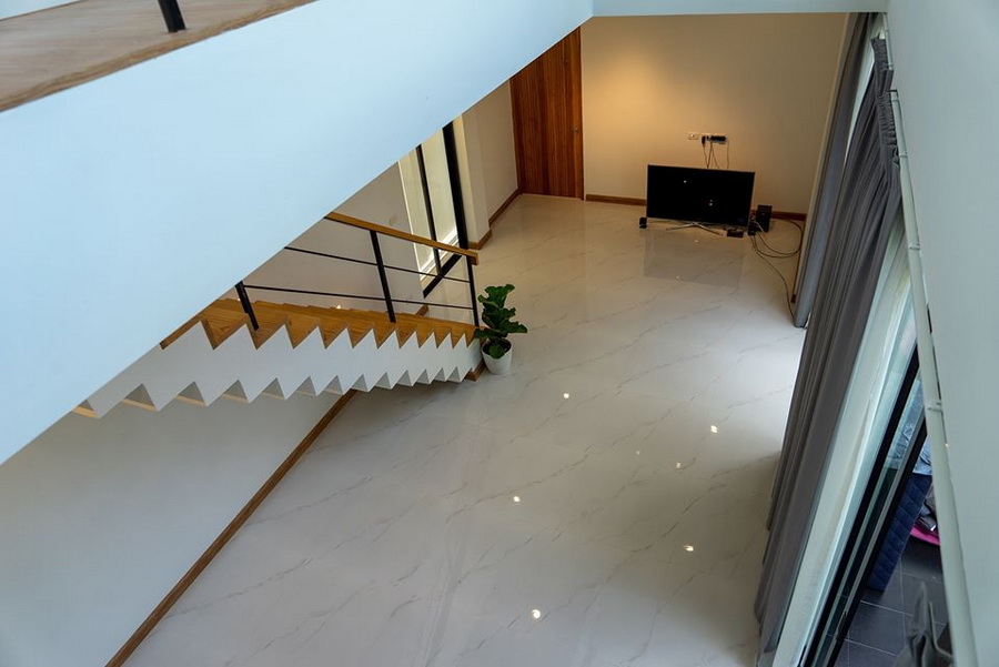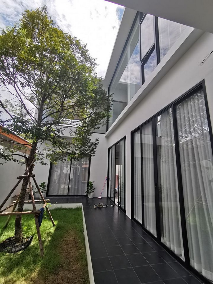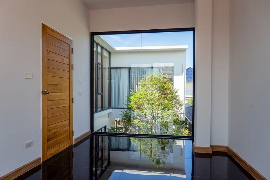 นอกจากนี้บริเวณด้านหน้าตัวบ้านของชั้นสอง จะถูกออกแบบด้วยผนังกระจกใสบานใหญ่ ซึ่งทำให้บ้านโปร่งสบาย มีพื้นที่ในการรับชมวิวภายนอกได้อีกด้วย