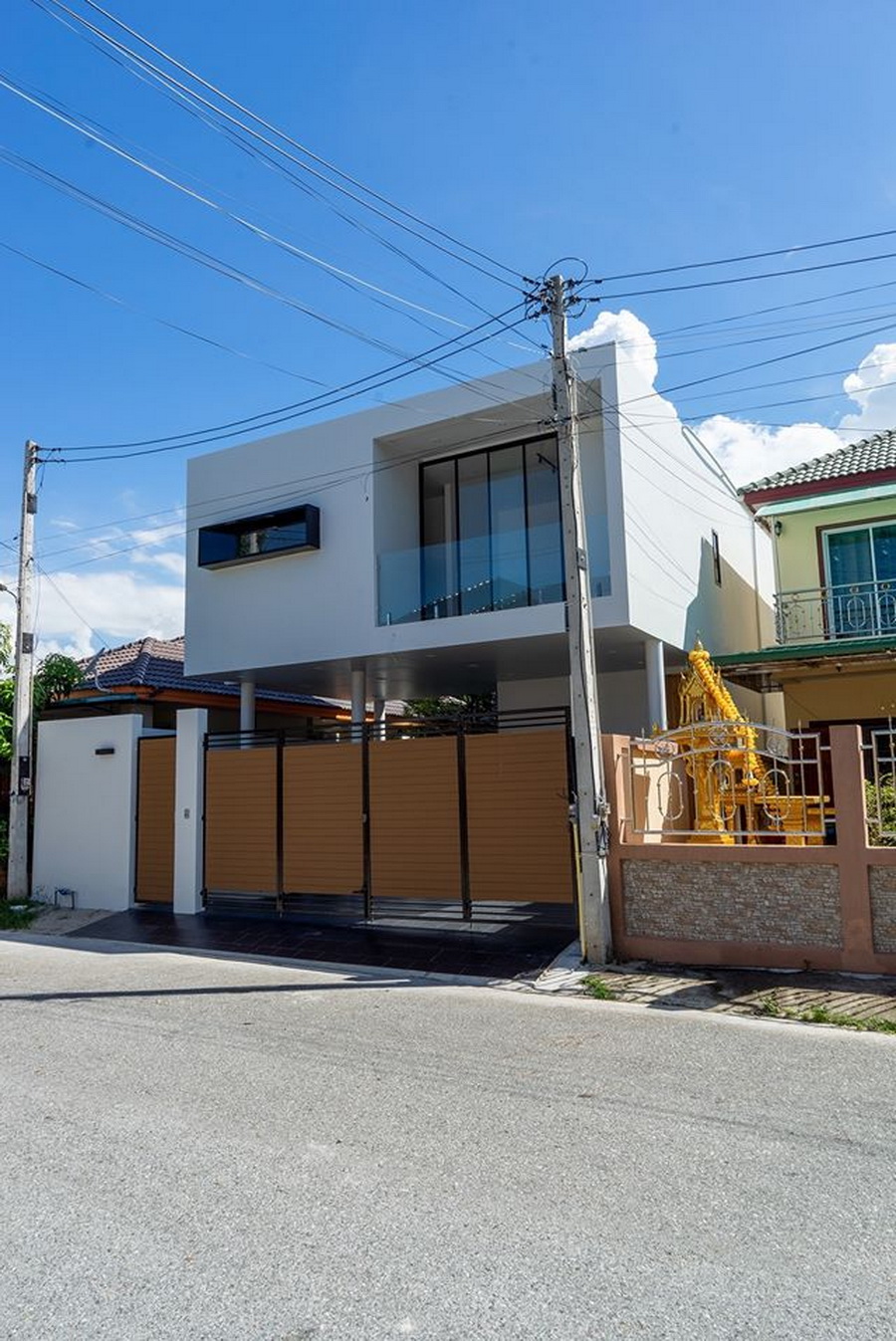 ลักษณะบ้านขนาดสองชั้น ตัวบ้านมีพื้นฐานการดีไซน์ในทรงกล่องแบบโมเดิร์น ภายนอกจึงให้ความเรียบง่าย แต่ก็ดูโดดเด่นสะดุดตากว่าบ้านในระแวกเดียวกัน ตัวบ้านเลือกใช้โทนสีขาวเกือบจะทั้งหมด ซึ่งให้ความสวยงามเรียบง่ายและยังช่วยสะท้อนแสงแดดทำให้บ้านเย็นอีกด้วย