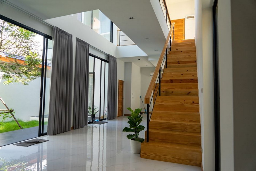 เมื่อเข้ามาภายในตัวบ้าน เราจะพบกับห้องโถงขนาดใหญ่ ซึ่งออกแบบเพดานแบบเปิดดล่ง นอกจากนี้ยังถูกตกแต่งในกลิ่นอายมินิมอลที่เน้นความโล่ง น้อยชิ้นและวัสดุอย่างไม้สีอบอุ่น