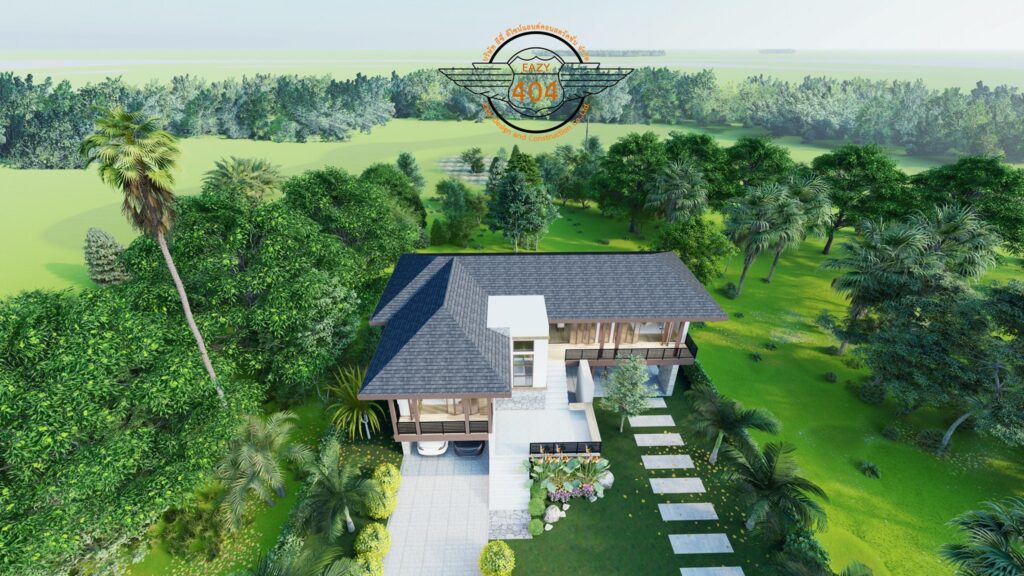 ลักษณะบ้านทรงใต้ถุนยกสูง มีพื้นที่เอนกประสงค์รับลม ซึ่งเป็นรูปแบบการสร้างบ้านไทยสมัยก่อน แต่ในขณะเดียวกันการจัดวางส่วนประกอบต่าง ๆ ของบ้านหลังนี้ก็เน้นเส้นสายเรขาคณิตที่สะท้อนกลิ่นอายบ้านโมเดิร์นอย่างชัดเจน