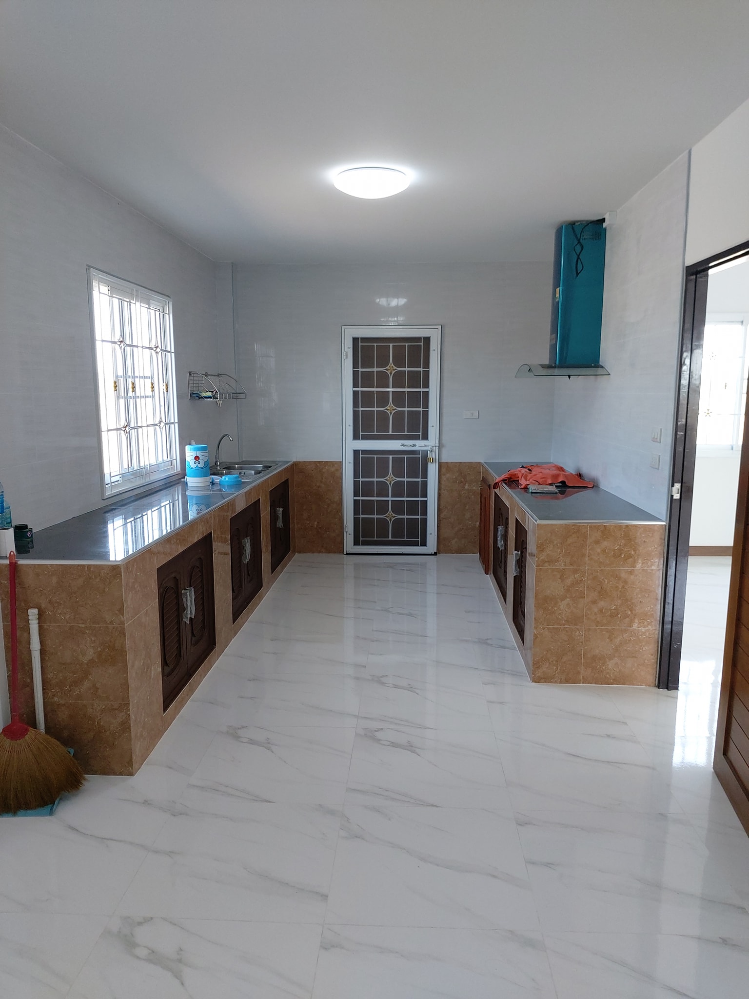 ทางด้านของห้องครัว เป็นอีกพื้นที่หนึ่งที่มีขนาดกว้างและโปร่งสบาย ภายในออกแบบติดตั้งเคาน์เตอร์ครัวแบบติดผนังไว้สองฝั่ง จึงช่วยอำนวยความสะดวกได้เป็นอย่างดี