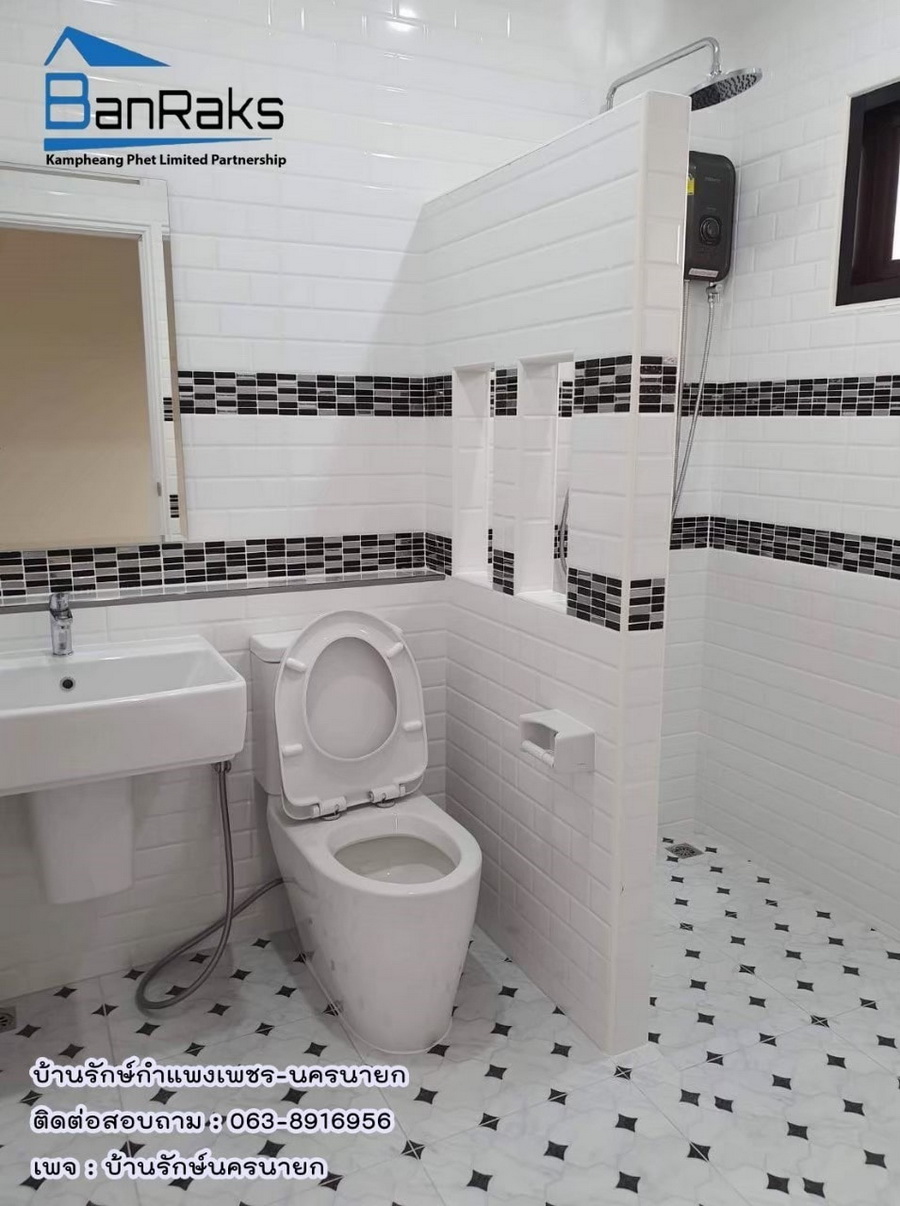 และห้องสุดท้ายอย่างห้องน้ำ ถูกออกแบบมาอย่างสวยงามและเป้นสัดส่วน โดยเลือกใช้กระเบื้องที่สลับโทนสีขาวดำ ภายในห้องแบ่งพื้นที่แบบแห้งและแบบเปียกให้ใช้งานอย่างเป็นสัดส่วน