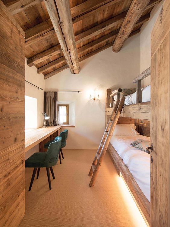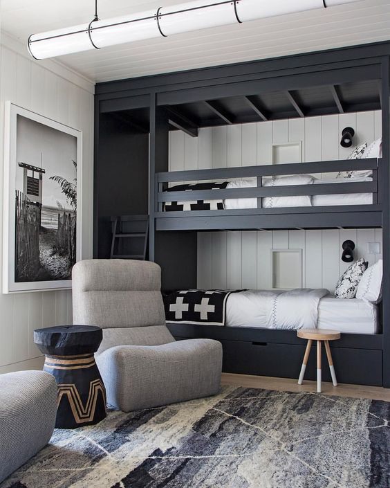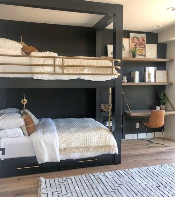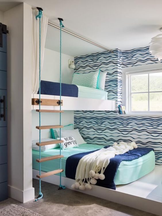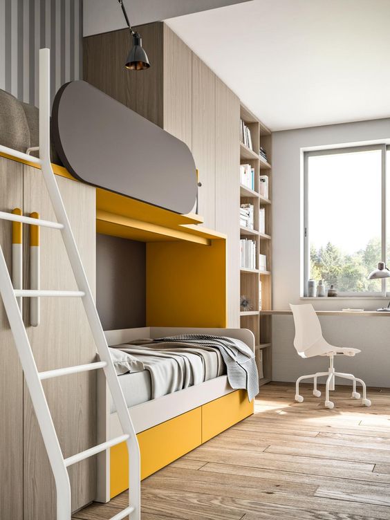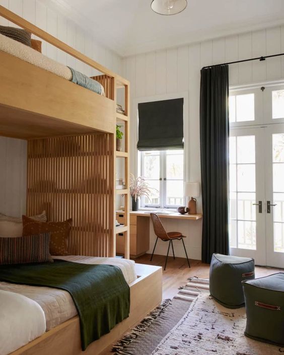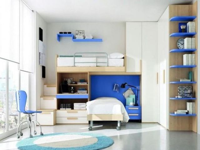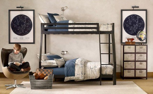 การจัดห้องนอนในลักษณะนี้มักเป้นห้องที่มีขนาดไม่มากนัก จึงใช้เตียงสองชั้นที่ช่วยประหยัดพื้นที่ ทำให้ต้องมีการตกแต่งกันระหว่างเด็กทั้งสองว่าใครอยากจะนอนชั้นไหน