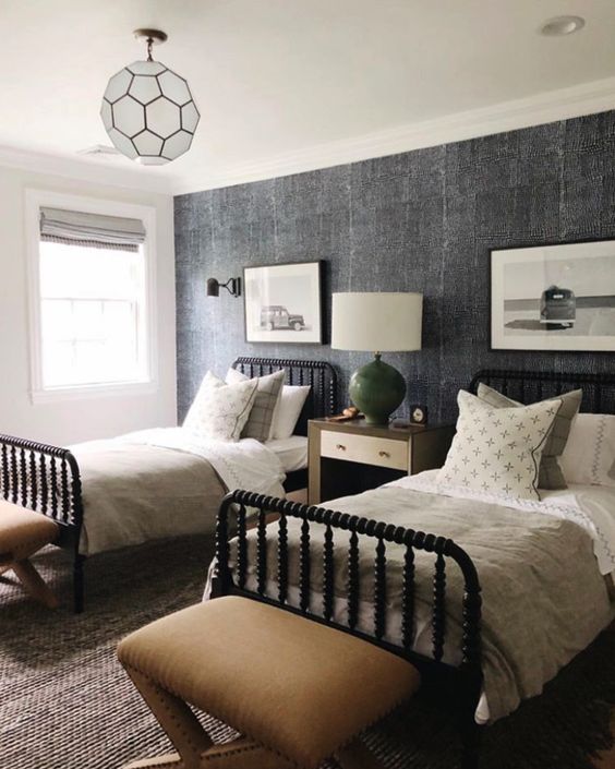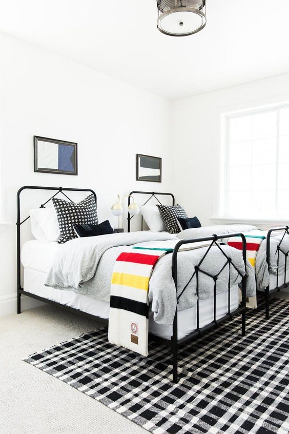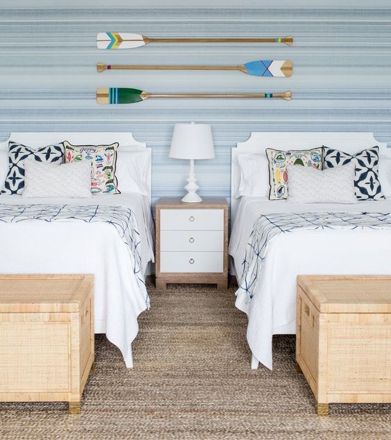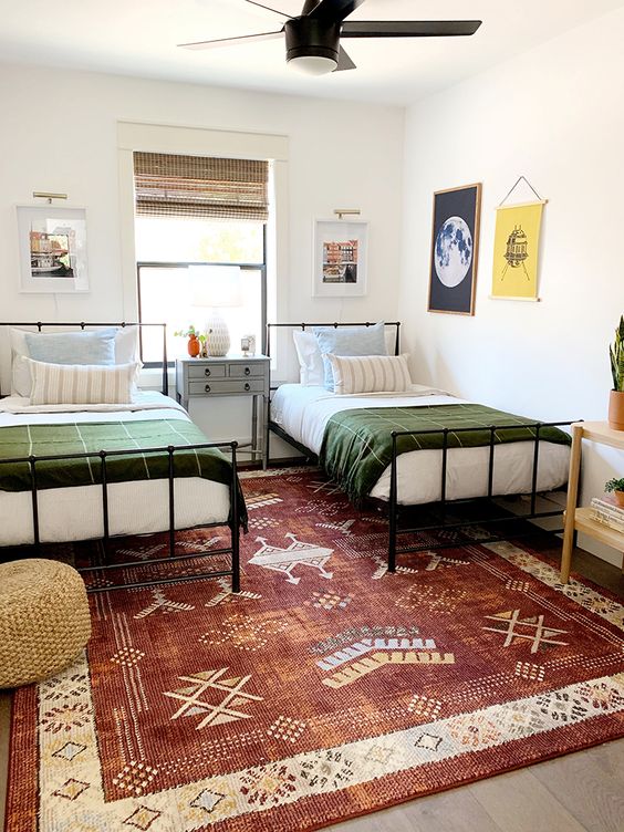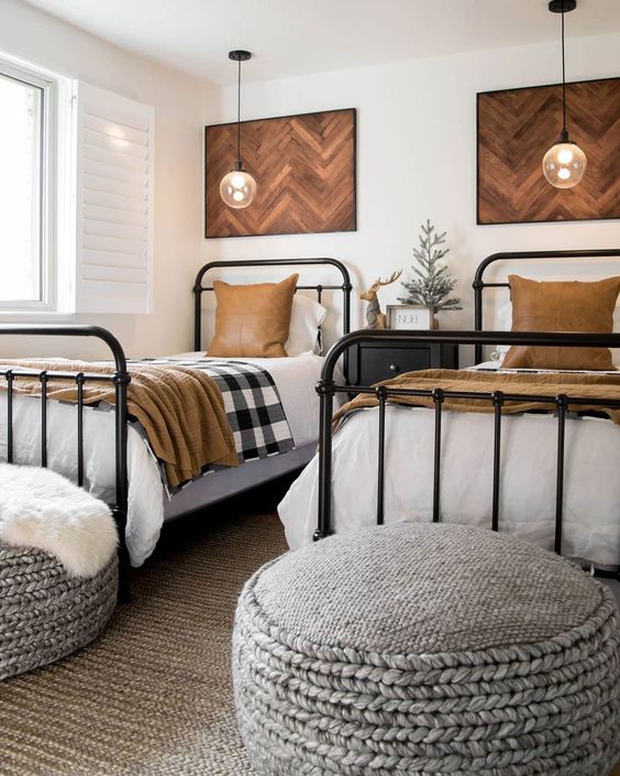 การตกแต่งห้องนอนลักษณะนี้จะเลือกจัดวางเตียงคู่สองเตียง ทำให้ภายในห้องจำเป้นจะต้องมีพื้นที่กว้างพอสมควร ซึ่งข้อดีคือเด็กๆ จะมีพื้นที่ของตัวเองที่มาก สามารถทำกิจกรรมได้หลากหลาย