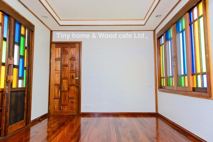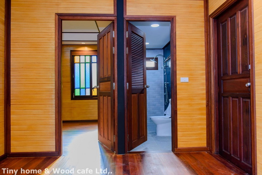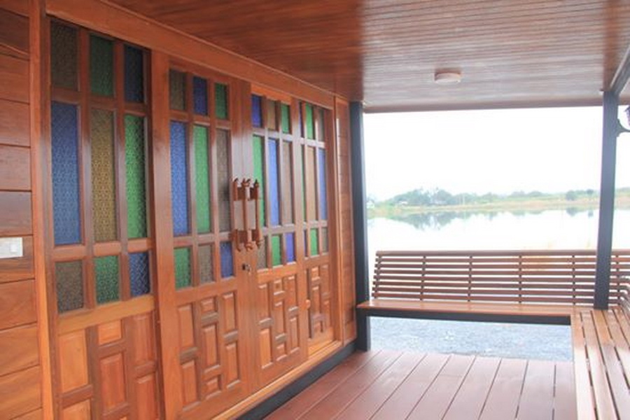 22. บ้านไม้น็อคดาวน์ชั้นเดียว กลิ่นอายแบบเรือนไทย 2 ห้องนอน 3 ห้องน้ำ โดดเด่นด้วยบานประตูกระจกสี