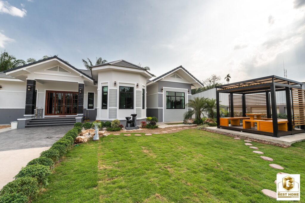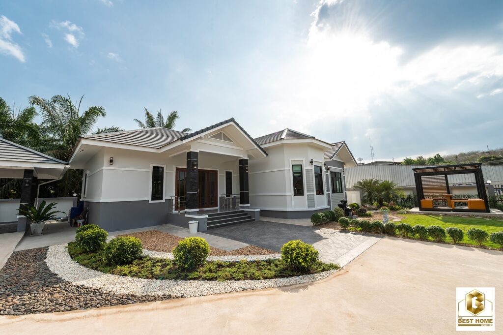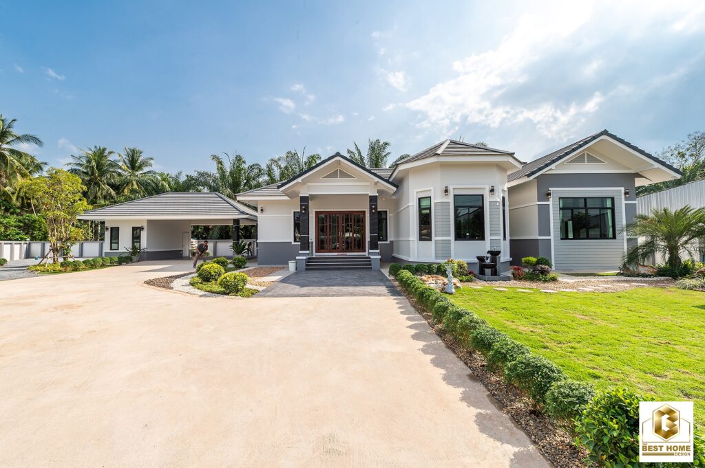 บ้านชั้นเดียวสไตล์คอนเทมโพรารี ผลงานการก่อสร้างโดยทีมงาน The Best Home รับสร้างบ้าน สุราษฎร์ฯ และตกแต่งภายในโดยทีมงาน Weekend Home Design บ้านร่วมสมัยบนที่ดินรูปทรงห้าเหลี่ยม บรรยากาศรีสอร์ต รายล้อมไปด้วยธรรมชาติ แฝงการตกแต่งสุดหรูหราไว้ภายใน ตามมาชมกันเลยครับ