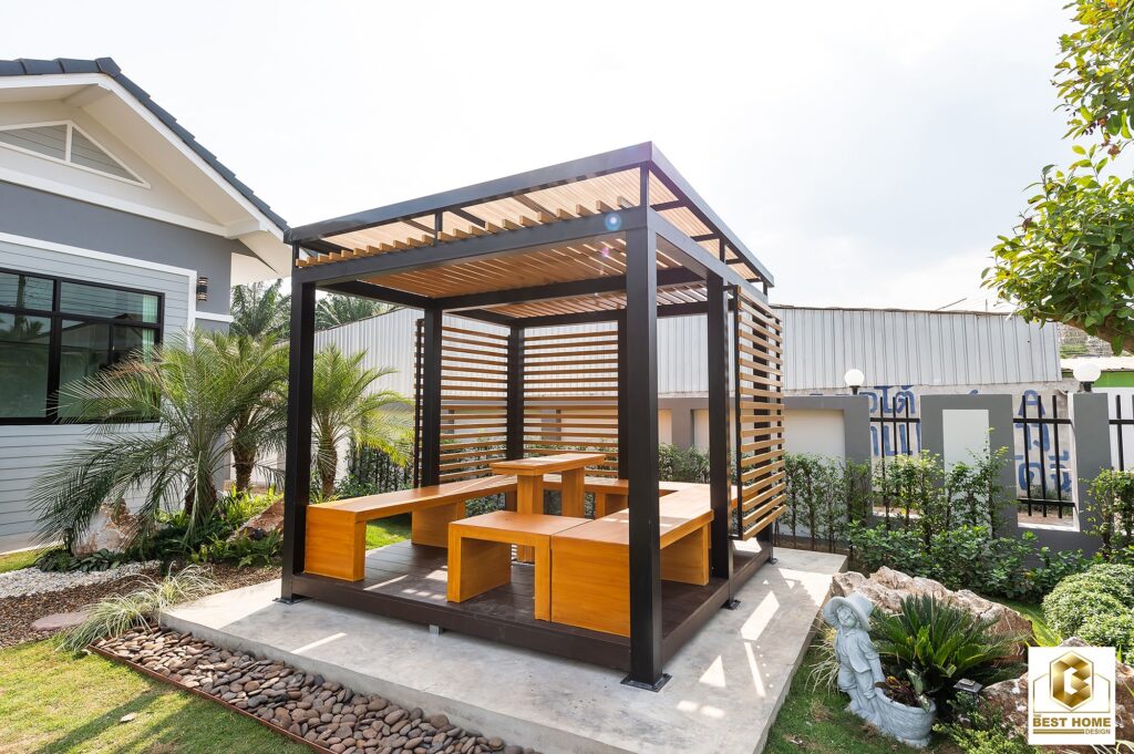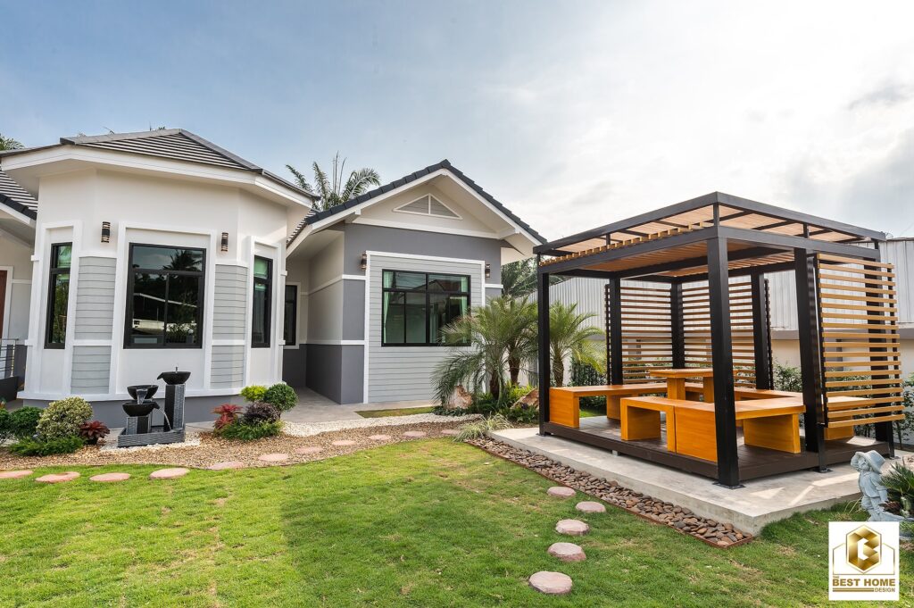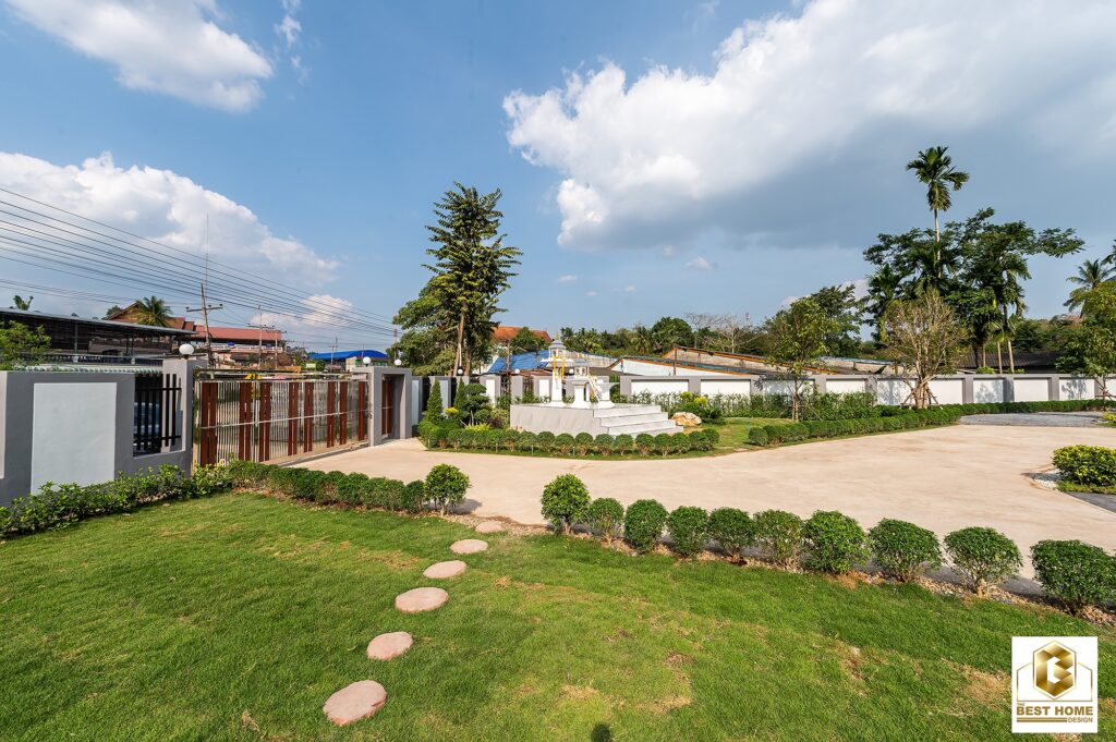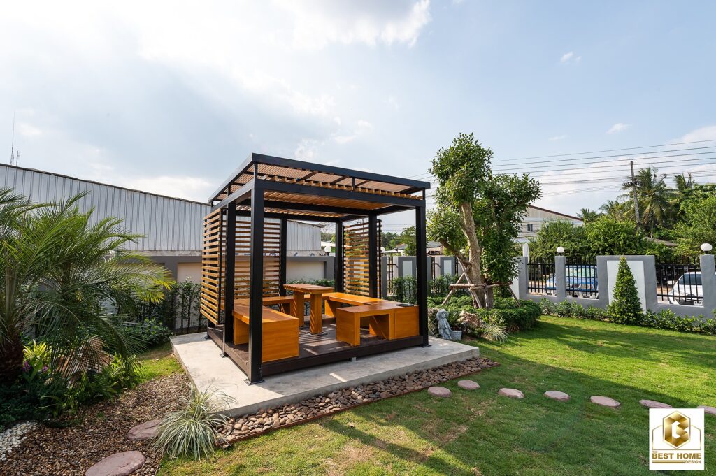 บริเวณสนามหญ้ามีสวนหย่อมเล็ก ๆ ประดับอยู่ด้านหน้าตัวบ้าน วางแผ่นหินทรงกลมสำหรับเป็นทางเดิน นอกจากนี้ ยังมีศาลาทรงโมเดิร์นสำหรับกิจกรรมกลางแจ้งในช่วงเวลาอากาศดีอีกด้วย