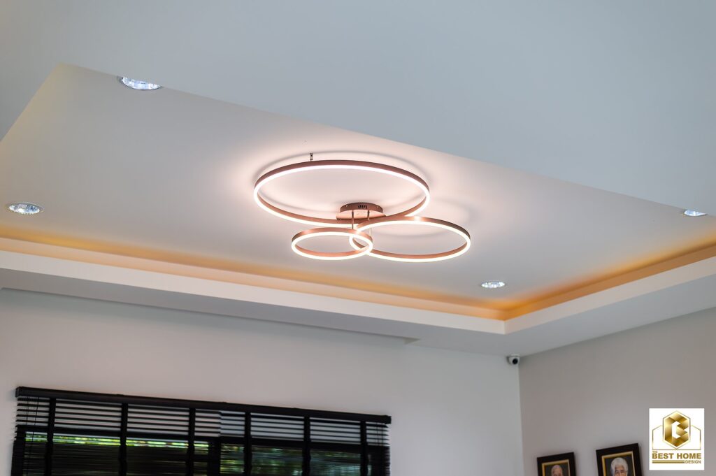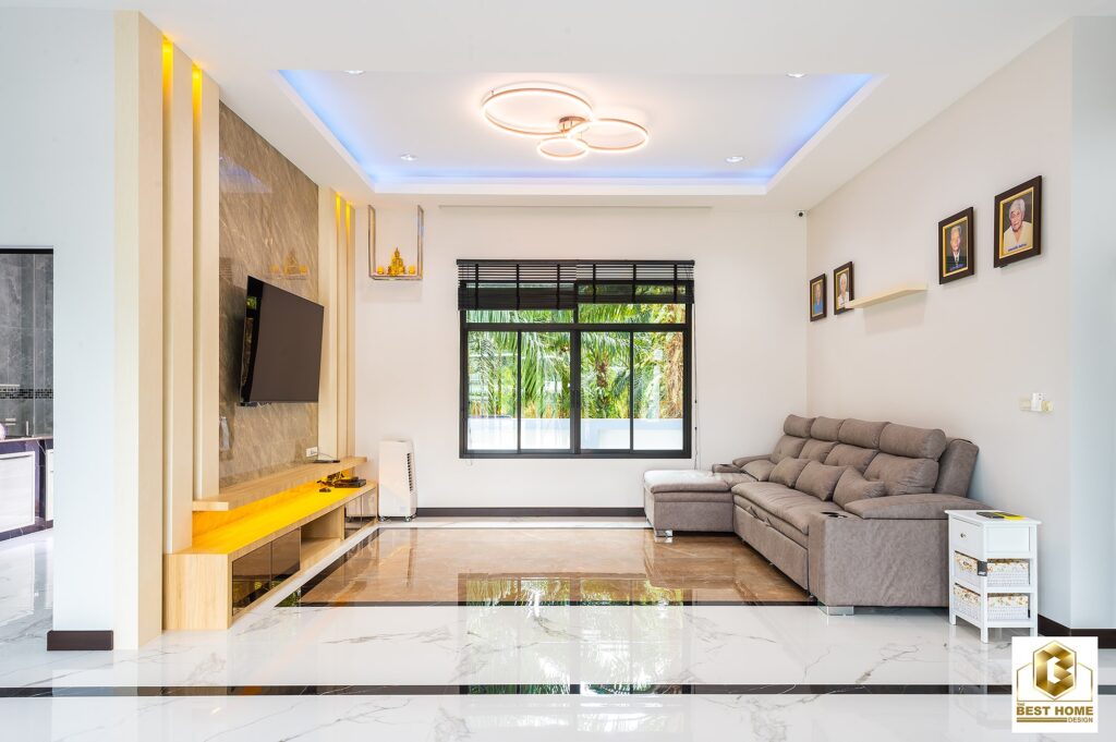ห้องนั่งเล่นโทนสีอบอุ่น เน้นโทนสีน้ำตาล สีครีม โอบล้อมด้วยโทนสีขาว โดดเด่นด้วยฝ้าเพดานหลุมและแชนเดอร์เลียดีไซน์สุดชิค